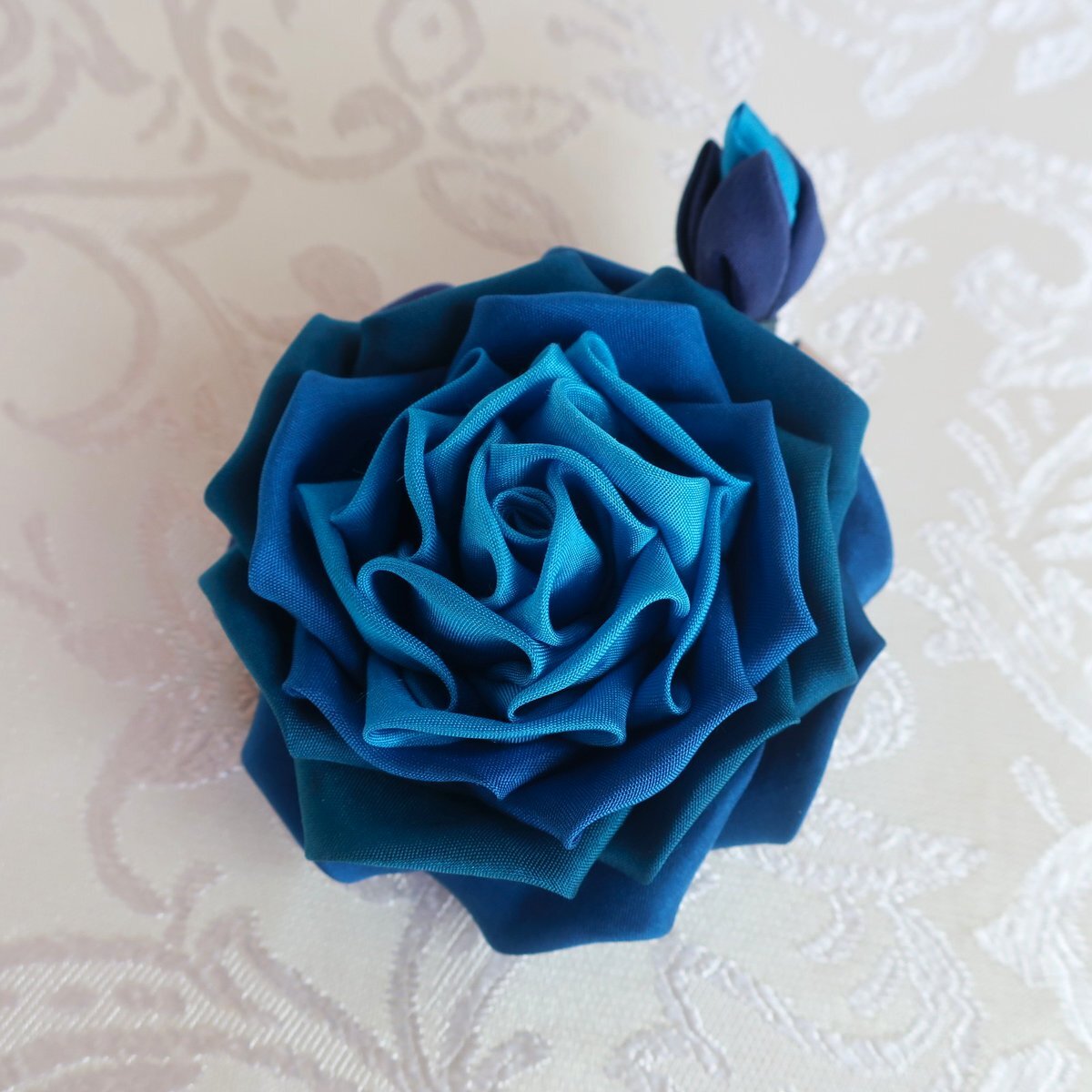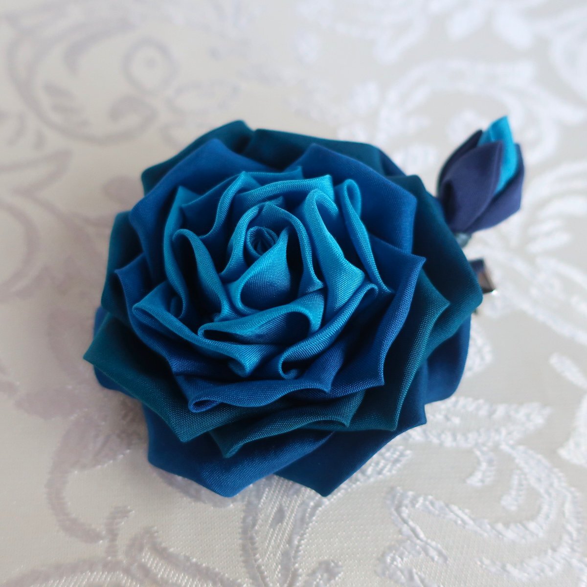ヘアークリップ、完成しました。 青系6種類に染め分けました。 中心の青色は、ごく中心だけを微妙に明るい青に。見ても区別つきませんが、印象が明るくなりました。こだわりの薔薇です。#成人式髪飾り #正絹 #青い薔薇 #ヘアークリップ #シルク creema.jp/item/20082924/… minne.com/items/44325237 pic.x.com/QqK9NidupX