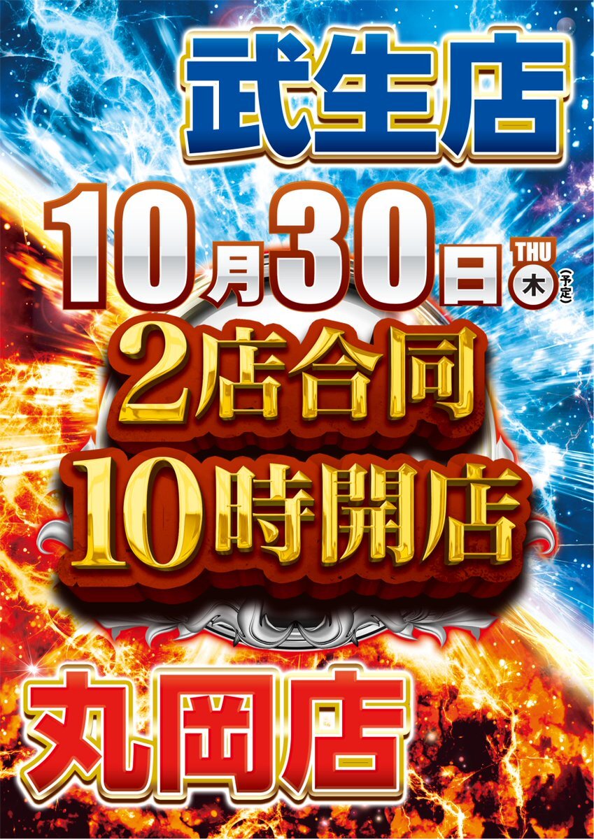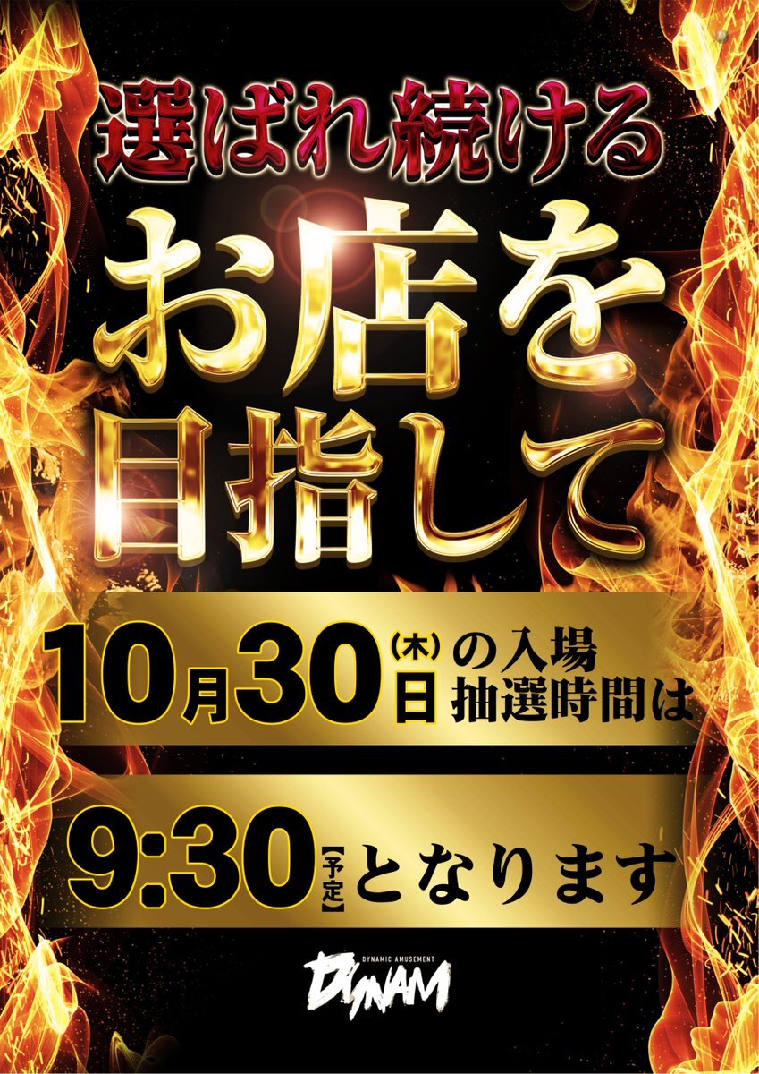 Nです😎 10月30日木曜日は丸岡店、武生店 『2店舗合同10時開店』です🤗 抽選から全てが始まる 抽選は「9時30分」です! ぜひ、皆さんお越し下さいませ🙏 #ダイナム #丸岡 #武生 pic.x.com/BDkXb86z6B