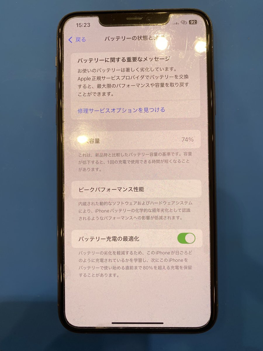 ケアモバ武生楽市です。本日はiPhone11ProMaxのバッテリー交換のご紹介。バッテリーの劣化メッセージが出て最大容量が74%にまで落ちておりました。これぐらいになると1日もたなくなってきます。バッテリーの交換はケアモバにお任せ!0778-78-0806まで!#スマホ修理 #越前市 #武生 pic.x.com/31O9xWEXIw