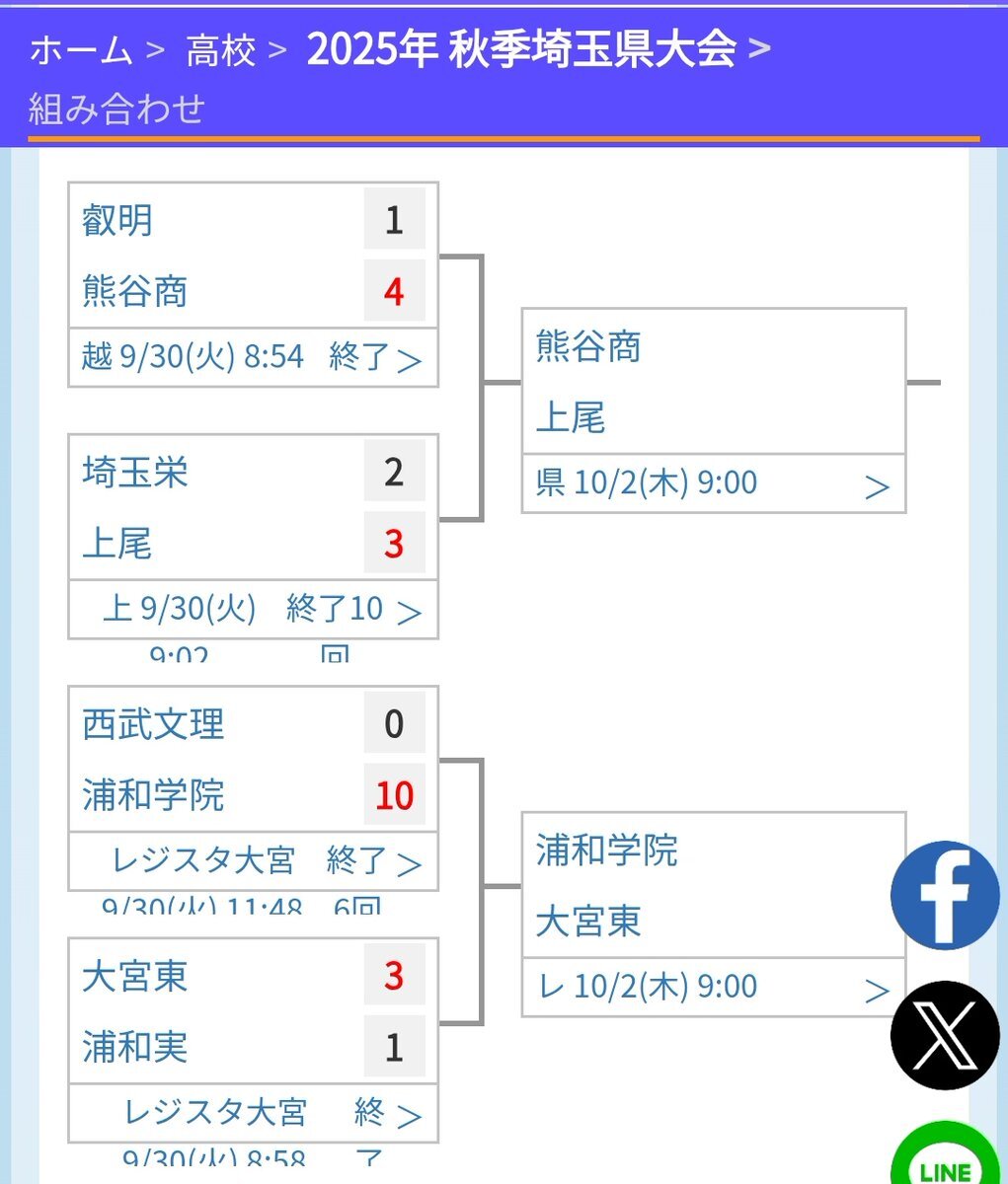 ⚾️2025秋季高校野球埼玉大会地区別ベスト8 ▷東部地区 校2←4校 春日部共栄 花咲徳栄 ▷南部地区 3校←5校 浦和学院 大宮東 浦和麗明 ▷北部地区 3校←4校 上尾 熊谷商 秀明英光 ▷西部地区 0校←3校 ▶一球速報com baseball.omyutech.com/CupHomePageTou… x.com/koukouyakyuFC/…