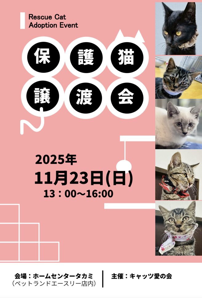 11月23日(日)に、鹿児島県薩摩川内市のホームセンタータカミ(ペットランドエースリー店内)さんで、保護猫譲渡会を開催します。 お近くの方は、是非お越しください。 可愛い子達がお待ちしております。 #保護猫を家族に #薩摩川内市 #ホームセンタータカミ #保護猫譲渡会 #殺処分ゼロ #幸せの切符 pic.x.com/ZrFzuGLibi