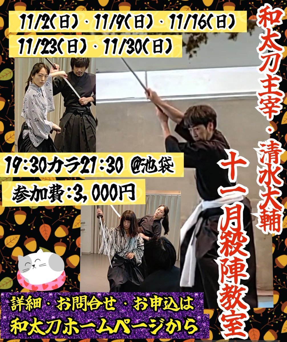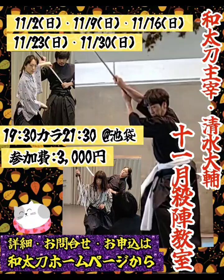 🍂和太刀主宰・清水大輔11月殺陣教室 🌈11/2(日)・11/9(日)・11/16(日)・11/23(日)・11/30(日) @池袋MIBスタジオ(19:30〜21:30) 参加費3000円 詳細・お問合せ・お申込は 和太刀ホームページから 💫10/26(日)も受付中です watachi.jimdofree.com #殺陣 #和太刀 #殺陣教室 #参加者募集中