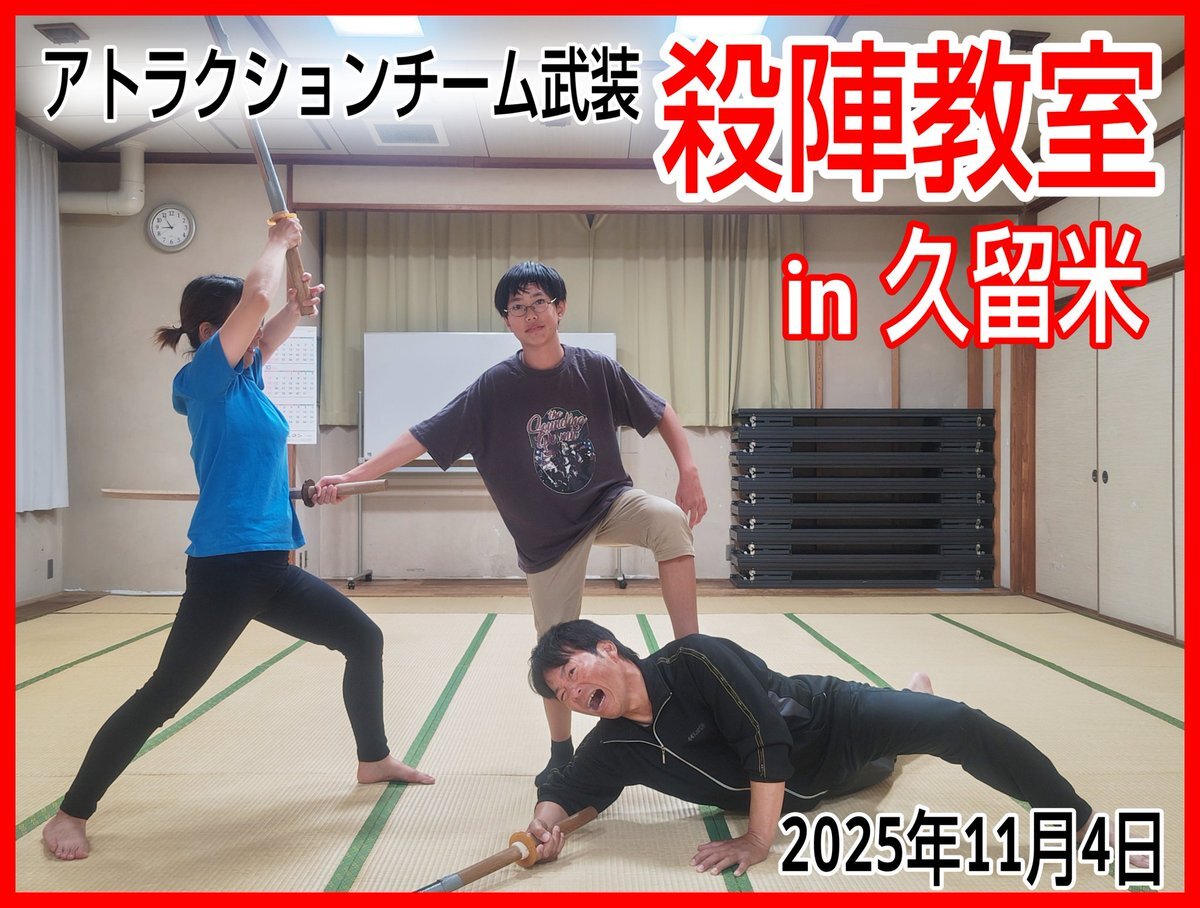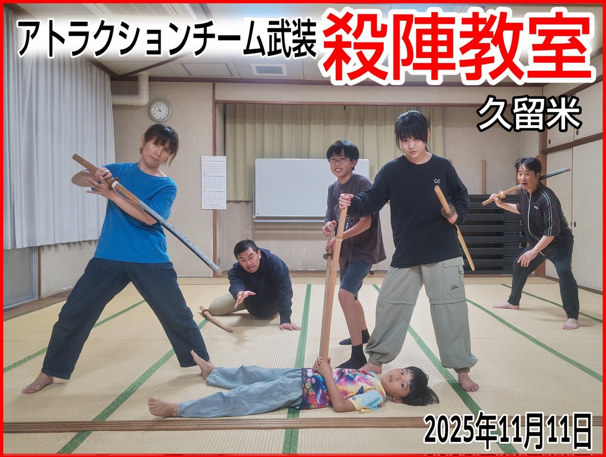 明日11月11日(火)はアトラクションチーム武装の殺陣教室です。 福岡県久留米市にて18時〜21時。 未経験者歓迎・参加者募集中。 要予約となってますので参加ご希望の方はお問い合わせください。 #殺陣教室 #殺陣 #アクション #久留米 #福岡 #アトラクションチーム武装 #チャンバラ #ヒーローアクション pic.x.com/GGgSYRa2Vk