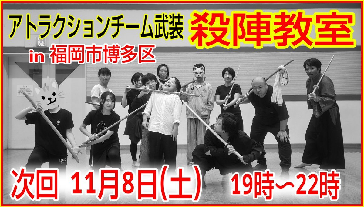 明日11月18日(火)はアトラクションチーム武装の殺陣教室です。 福岡県久留米市にて18時〜21時。 未経験者歓迎・参加者募集中。 要予約となってますので参加ご希望の方はお問い合わせください。 #殺陣教室 #殺陣 #アクション #久留米 #福岡 #アトラクションチーム武装 #チャンバラ #ヒーローアクション pic.x.com/AqCd7ZHdae