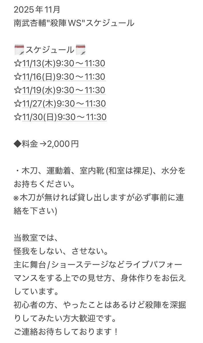 おはようございます 南武復っっっ活!! この二日間ダウンしておりましてご迷惑をおかけしてしまいました😭 おかげで復っっ活!! 元気に #殺陣教室 今月もやってますので是非 ☆11/13(木) ☆11/16(日) ☆11/19(水) ☆11/27(木) ☆11/30(日) 詳細欲しい方はDMやリプにてご連絡下さいませ。 #殺陣ws pic.x.com/z1agEB1Jcd
