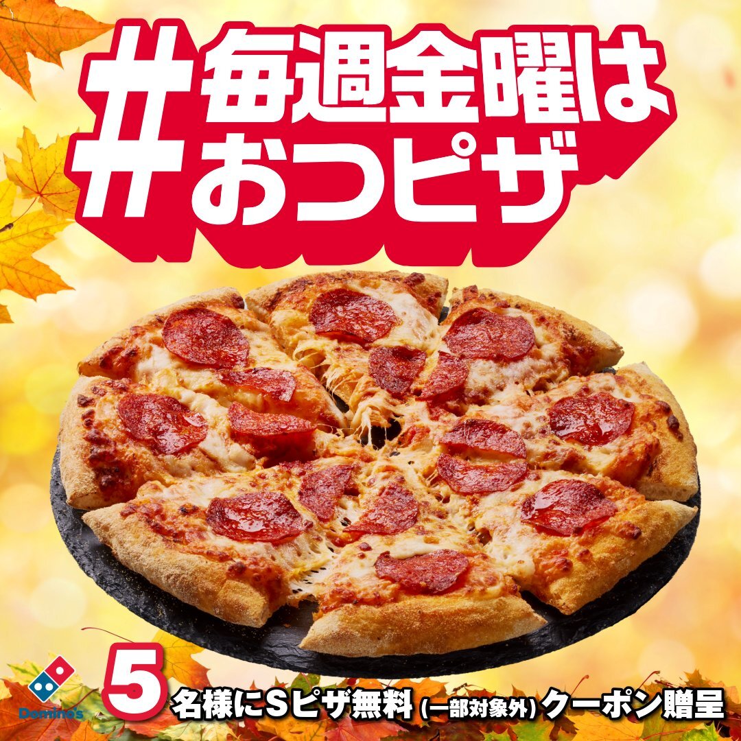 🍕5名様にSピザ無料が当たる🍕 今日の23:59までにフォロー&リポストすると、抽選で5名様にSピザ1枚(一部対象外)無料クーポン贈呈✨ 毎週金曜はドミノと一緒におつピザする? ※当選者のみ9/29中にDM送付