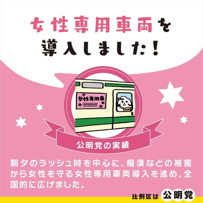 【公明党の実績!】 #女性専用車両 を導入しました! #比例区#公明党pic.x.com/I1m7SN8Lfj