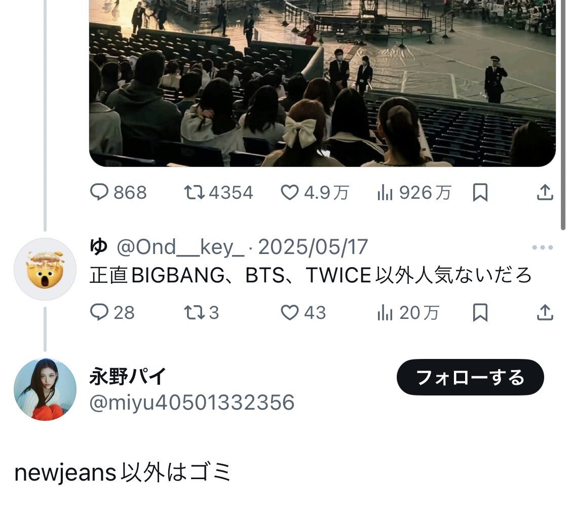 返信先:@icymiiykyk凄いなこのバニズさんついに憶測で攻撃しだしたよ 何故何の罪もないファンにまで攻撃してんの?やっぱいじめっ子ファンダムだから?? 自分達の数々の誹謗中傷いじめ行為は棚に上げて被害者面をし他者を攻撃するまさにダブスタ #Bunnies #民度 pic.x.com/zie9TToeag