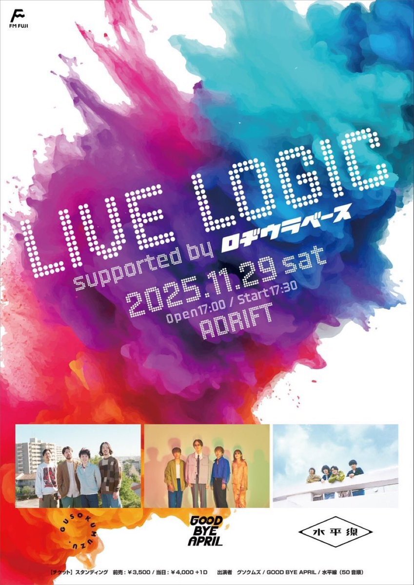 ✅初開催イベント 「LIVE LOGIC supported by ロヂウラベース」 出演:#グソクムズ #GOODBYEAPRIL #水平線 11月29日(土) 17:00開場・17:30開演 会場:東京 下北沢 #ADRIFT 🎫チケットは¥3500(ワンドリンク別) イープラスで好評発売中! fmfuji.jp/topics/1448/