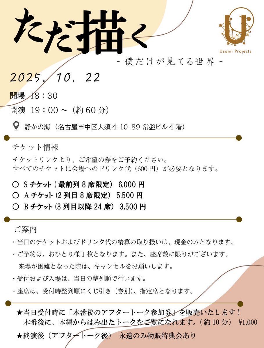 《イベント詳細》 『ただ描く-僕だけが見てる世界-』 2025/10/22(水) #横川結城 #永遠 開場 18:30 /開演 19:00 🎫3種類(画像参照) 🪑くじ引きによる指定席 画像やサイトのご案内を必ずご一読ください! 📣10/14(火)21:00~チケット予約開始 tiget.net/events/436148 #うさ兄プロジェクト pic.x.com/dLwNaw1lPK
