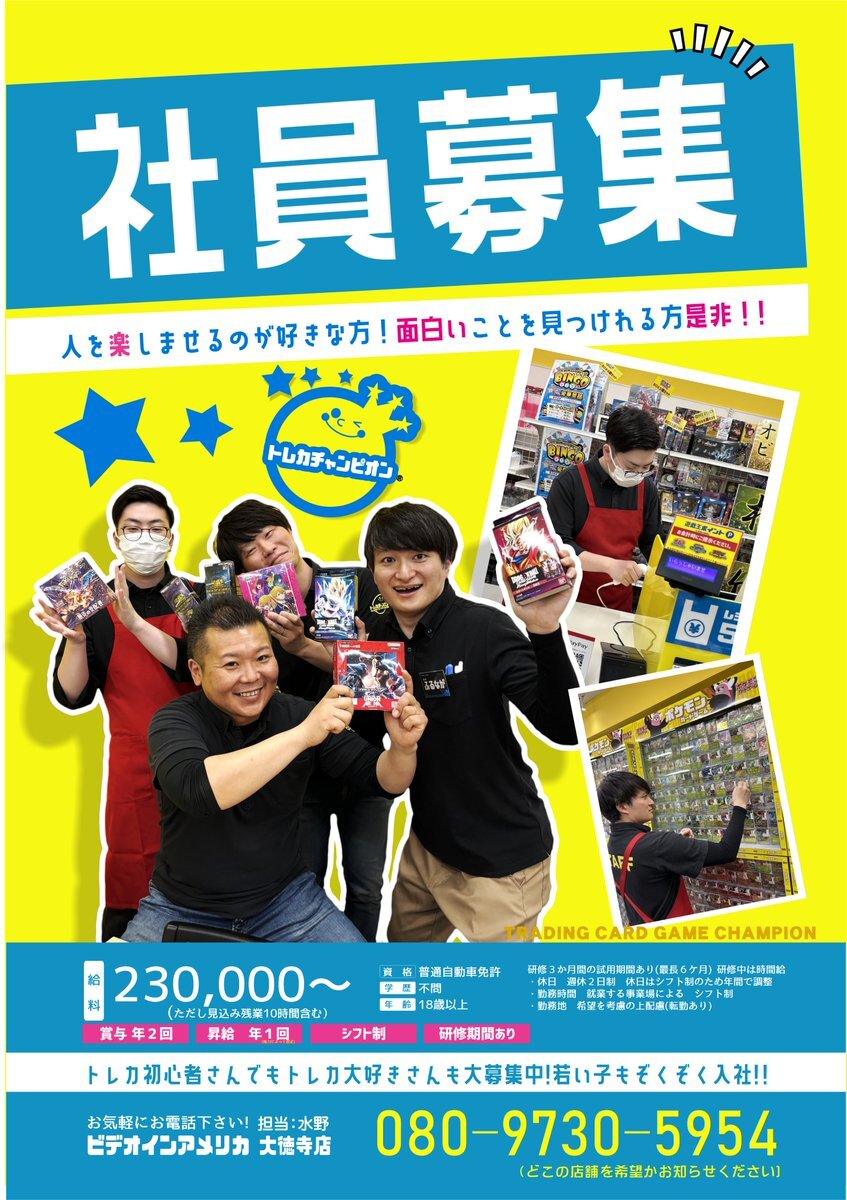 ☘️正社員大募集☘️ トレカチャンピオン、ビデオインアメリカグループでは 正社員を募集しております。 18歳以上で普通免許お持ちの方は、学歴、経験不問です。 お気軽にお電話下さい。ご応募をお待ちしております。 #求人募集 #正社員募集 pic.x.com/i7pPgWFo4m