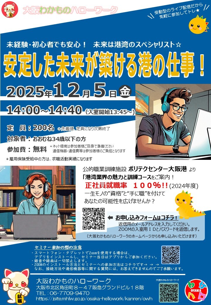本日14時開催!!「安定した未来を築ける港の仕事!」オンラインセミナー!!顔出しなしなので、気軽に楽しく参加できる好評のセミナーです🎵皆様のご参加お待ちしています✨ jsite.mhlw.go.jp/form/pub/roudo… #求職 #就活 #転職 #セミナー pic.x.com/t2w6CmsVXK