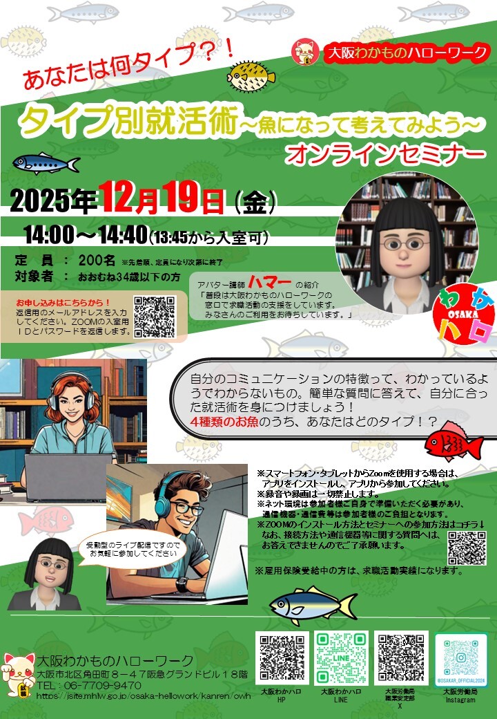 本日14時開催!!「タイプ別就活術~魚になって考えてみよう~」オンラインセミナー!!顔出しなし、クイズ形式なので、気軽に楽しく参加できると大好評のセミナーです🎵アバター講師ハマーが皆様のご参加お待ちしています✨ jsite.mhlw.go.jp/form/pub/roudo… #求職 #就活 #転職 #セミナー pic.x.com/4TbbFcW05B