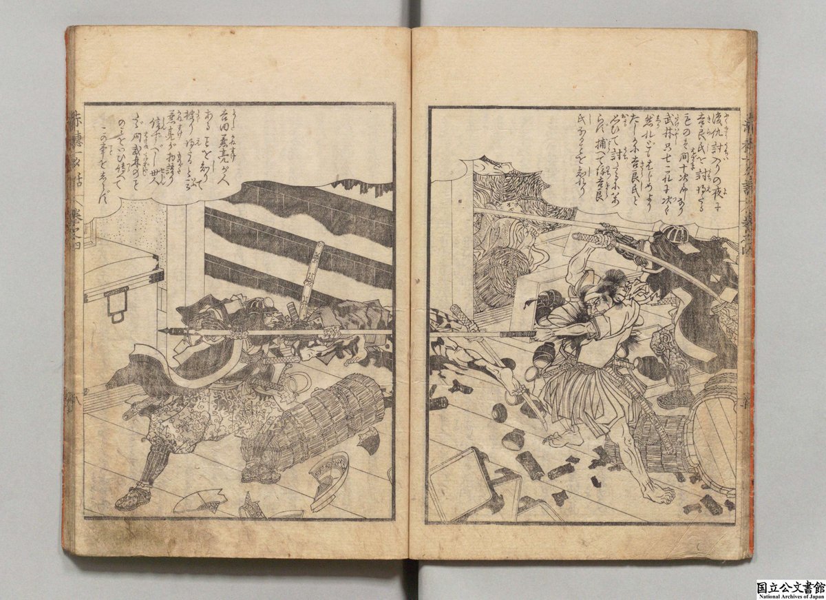 元禄15年12月14日 (旧暦)(1703年1月30日)、 #赤穂四十七士 が吉良邸に討ち入り。後世、様々に脚色され、芝居や講談で演じられます。 画像の嘉永7年版『赤穂義士伝一夕話』もその一つ。吉良上野介は物置に隠れていたと伝わります。 挿絵の中の吉良をぜひ探してみてください。 digital.archives.go.jp/img/3837912/9