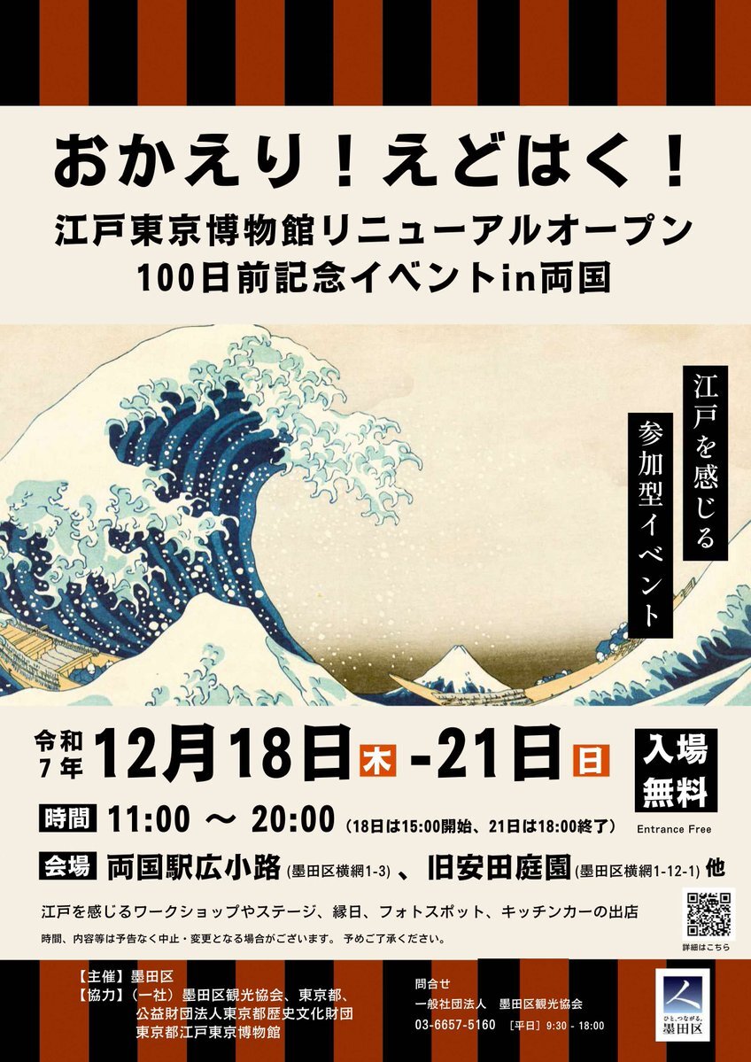 12/18~12/21まで、来年3/31に新しく生まれかわる #江戸東京博物館 への期待感が高まるリニューアルオープン100日前記念イベントを開催🎉 #両国駅 広小路や #旧安田庭園 を中心に、#江戸 の風情と現代の賑わいが融合した特別な4日間をお楽しみください✨ 詳しくは↓ visit-sumida.jp/event/edohaku1… pic.x.com/rsdGnzuOZF