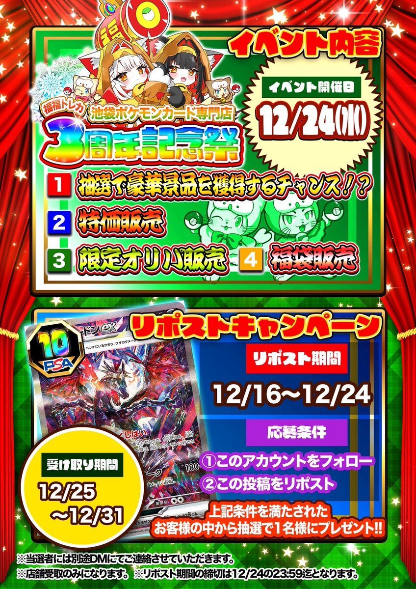 🦉福福トレカ池袋ポケモンカード専門店🦉 #福福ポケカ #ポケカ #池袋 12/24、当店は3周年を迎えます‼🎉 平素よりご愛顧頂き誠にありがとうございます😻 当日は様々なイベントを準備中です🎵 当アカウントフォローの上このポストをRP頂くと、抽選でリザードンexSAR pic.x.com/IwWxeMuIzb