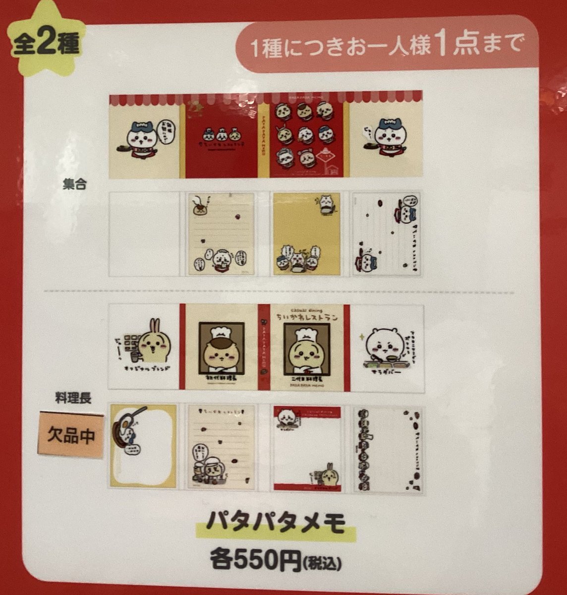 常設店「ちいかわレストラン」 【グッズ欠品情報】 ・パタパタメモ(料理長) 上記の商品は欠品となっております。 再入荷の際は、本アカウントでお知らせいたします。 #ちいかわレストラン #ちいかわ #池袋parco pic.x.com/fJZo2VYoZI