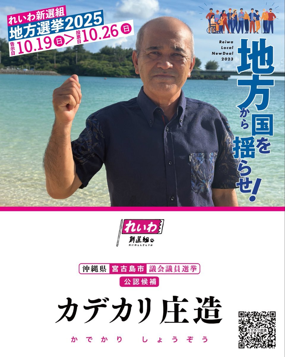 本日告示☀️ 宮古島市議会議員選挙! 沖縄県 #宮古島市議選 は れいわ公認 #カデカリ庄造 reiwa-shinsengumi.com/member/jichita… どうかお力をお貸しください。 #宮古島市 の友人、知人等に 拡めてください🙌🏻 投票日は10月26日(日)です🗳 ※期日前投票の会場などは>> city.miyakojima.lg.jp/soshiki/senkyo… #沖縄県 pic.x.com/toxIZE7m9w