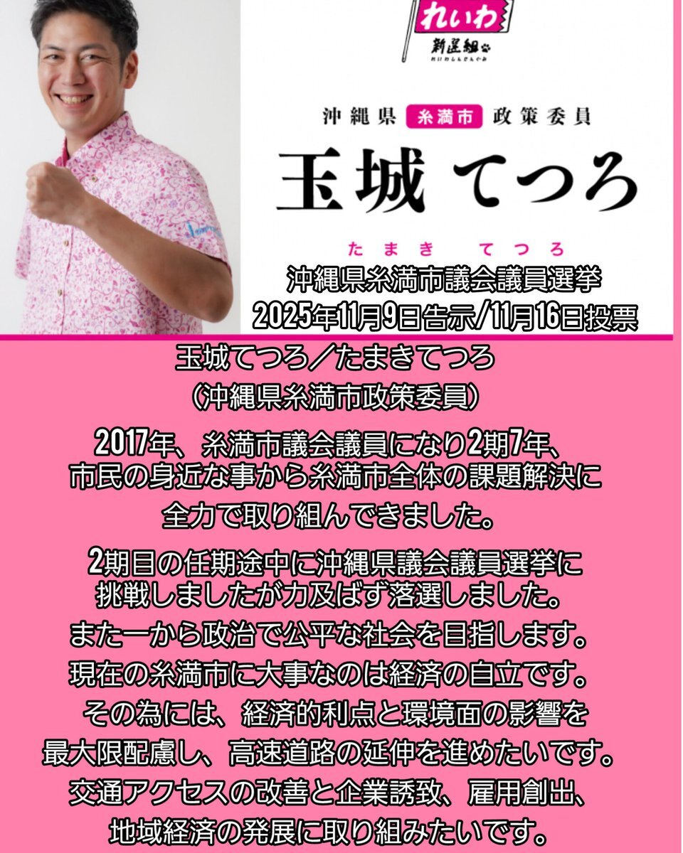 #れいわ新選組 🐾 #沖縄県 #糸満市議会議員選挙 告示2025年11月9日 投票11月16日 公認候補予定者 #玉城てつろ 糸満市政策委員 X @Tetsuro19850925 Tiktok tiktok.com/@tetsuro_tamak… 10/16 x.com/tetsuro1985092… 10/18 x.com/tetsuro1985092… 10/20 x.com/tetsuro1985092… pic.x.com/xmRcK378nM