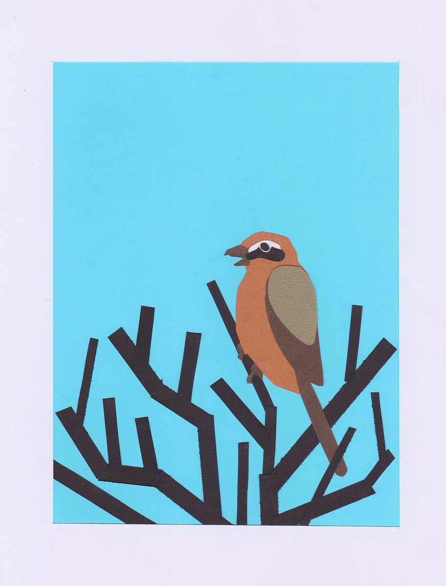 作品名「モズの高鳴き」(再掲) 冬の澄んだ空にもずの声がよく響きます。 #art #切り紙絵 #切り絵 #アート #油絵 #モズ #野鳥 pic.x.com/mipnXozhP7