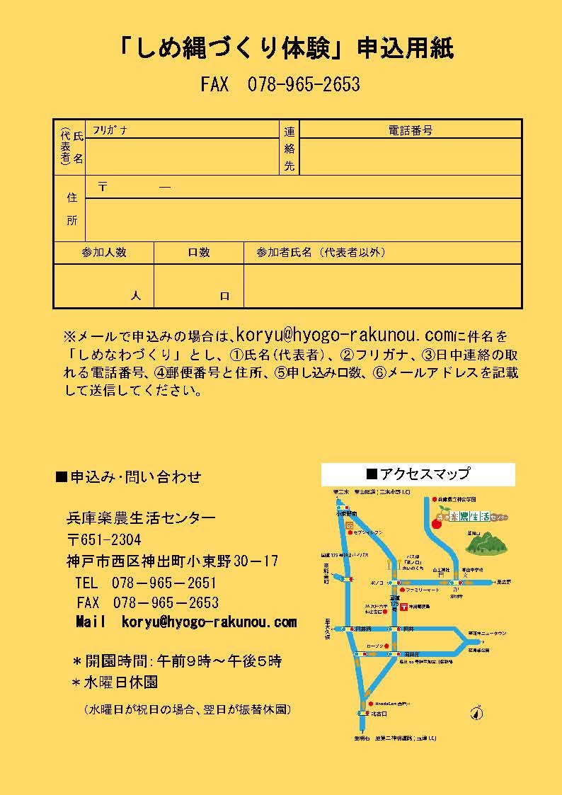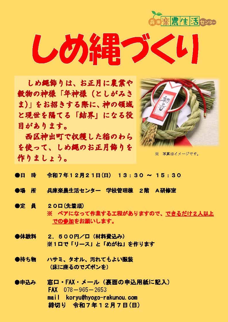 🎍12/21(日) 体験イベントのお知らせ🎍 ♪もういくつ寝ると…♬ という訳で、お正月には必須のしめ縄を作りませんか? 1口で2つのしめ縄飾りが作れるのでお得! 正面玄関や裏口などに、手作りしめ縄を飾りましょう🌅 お申込はFAX又はメール(koryu@hyogo-rakunou.com)から! #体験教室 #しめ縄 #注連縄 pic.x.com/aEfKUpLEGU