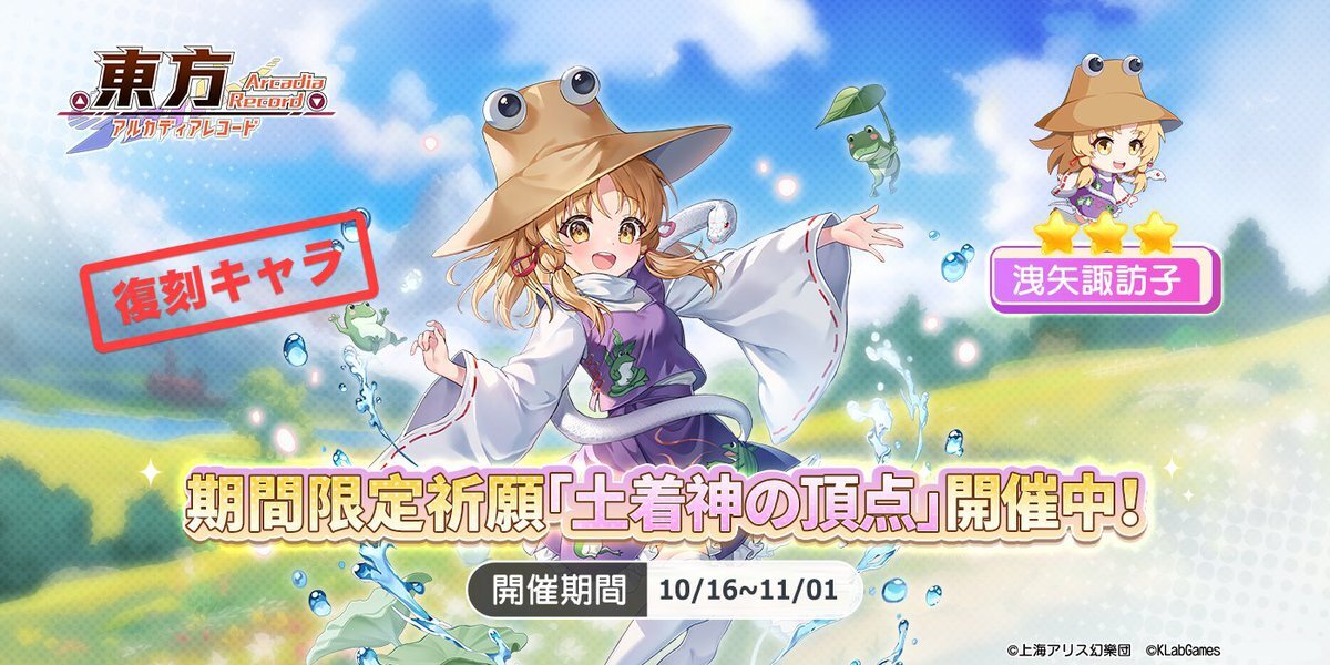 【期間限定復刻祈願「土着神の頂点」開催中】 期間限定で、限定★3キャラクター 洩矢諏訪子の出現率UP✨ 開催期間:10月16日(木)12:00~11月01日(土)11:59まで ※期間限定復刻祈願終了後は通常祈願から出現しないため 獲得したい方はお見逃しなく‼️ #東方アルカ #洩矢諏訪子 pic.x.com/LApCCvJafb