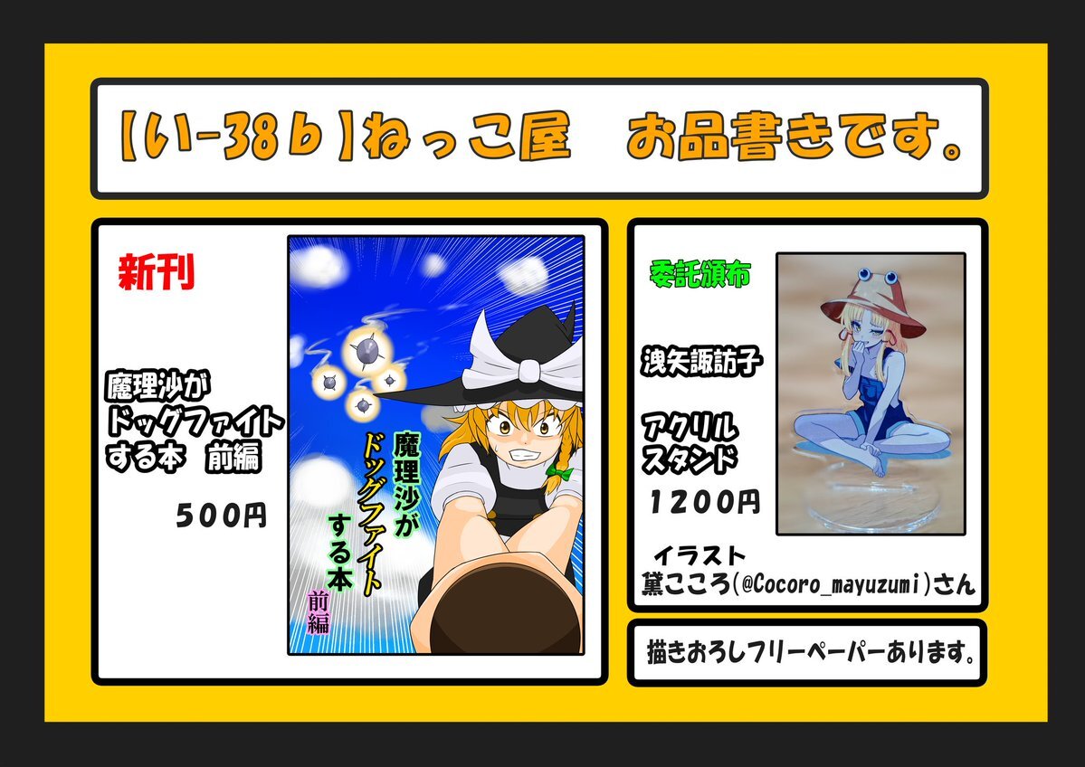 😼第4回告知😺 当日のお品書きです。 フリーペーパーもありますので、是非立ち寄ってみて下さい😊 #秋季例大祭12 #東方Project #霧雨魔理沙 #洩矢諏訪子 #ねっこ屋さん pic.x.com/9FPgg6txgB