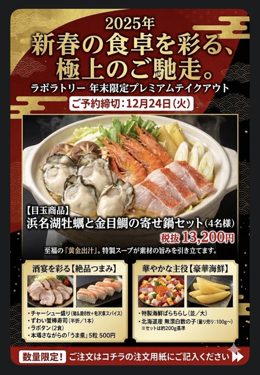 🎍予約開始🎍 今年の年末、おせちに飽きた人へ。 浜松ラボラトリーが本気出しました。 「ジビエの焼豚」に「浜名湖牡蠣と金目鯛の鍋」、「完全無漂白の数の子」など 家族で食べるもよし、一人で贅沢に呑むもよし。 数量限定 (詳細と予約はリプライ欄へ↓) #浜松グルメ #浜松テイクアウト #酒の肴 pic.x.com/vuQZAvguql