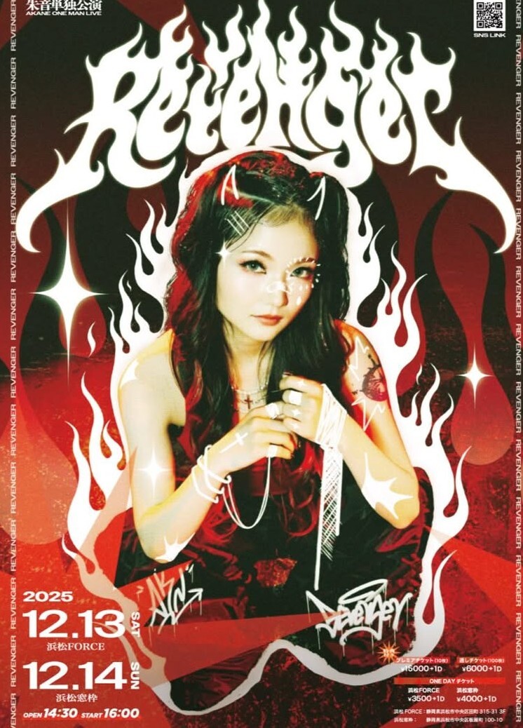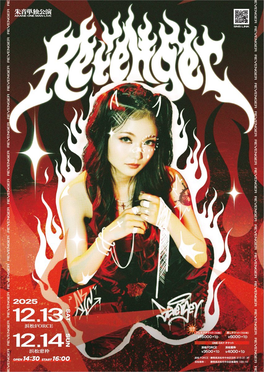 ⋱初2DAYS ワンマンライブ開催⋰ 朱音単独公演 Revenger  ̄ ̄ ̄ ̄ ̄ ̄ ̄ ̄ ̄ ̄ ̄ ̄ ̄ 🗓️ 2025.12.13 sat / 12.14 sun OPEN 14:30 / START 16:00 DAY1📍浜松FORCE @force_qm DAY2📍浜松窓枠 @Aw_one_kikaku 🎫プレミアチケット: 特典付き 『10枚』 ¥15000 🎫2DAYS 通しチケット