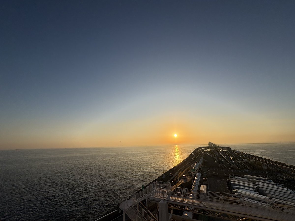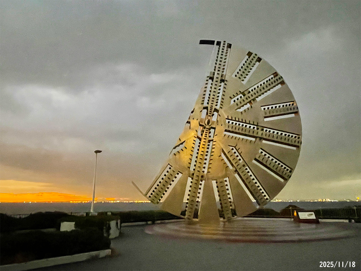 夕日に染まる「建設記念碑・カッターフェイス」 東京湾アクアラインの海底トンネルを掘り進んだシールドマシンのカッターを模したモニュメント。 マシンの直径は14.14mと世界最大規模。 現地にいる社員が先ほど撮影。 #海ほたる #アクアライン #土木の日2025 x.com/buyodo_1897/st… pic.x.com/L4rq2ZuhyL