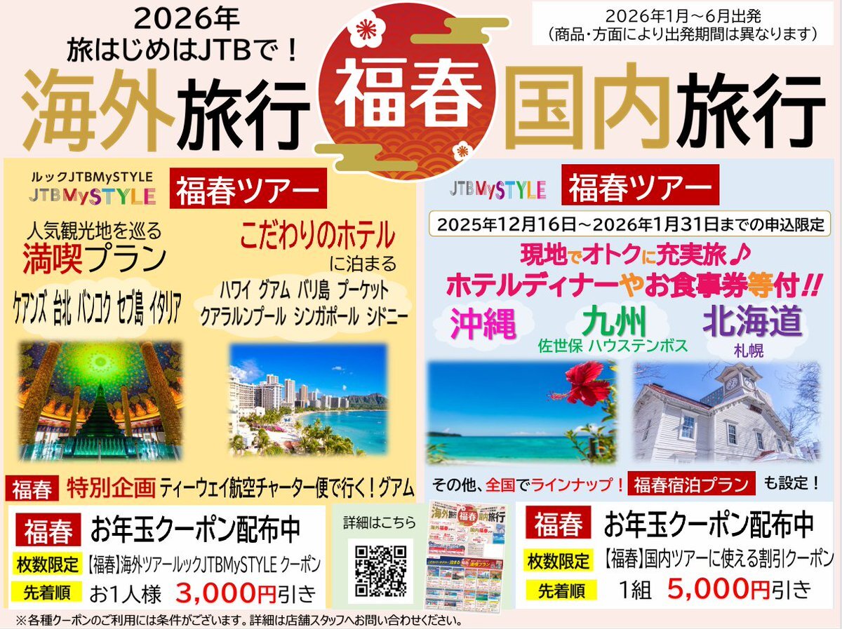 今年も発売になりました♪ 「2026年 旅はじめはJTBで!福春 海外旅行」 デジタルパンフレットはこちらからご覧いただけます↓ dp.jtb.co.jp/lookjtb/dp/pam… #阿寒バス旅行サービス #JTB #福春 #海外旅行 #国内旅行