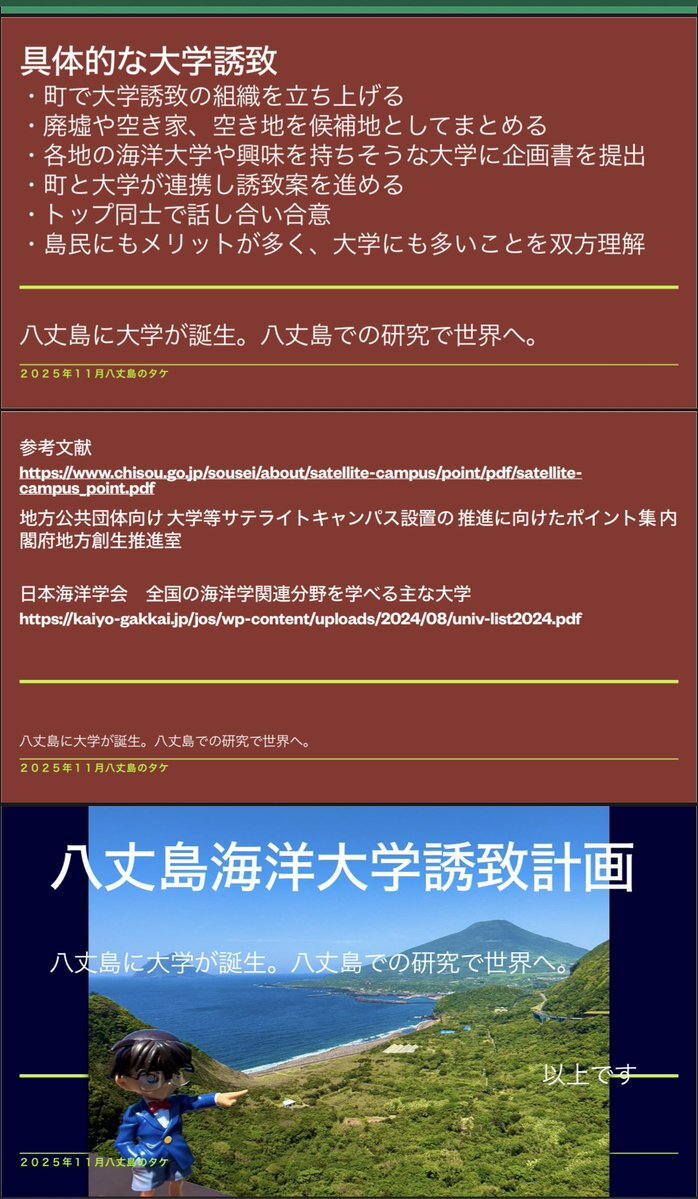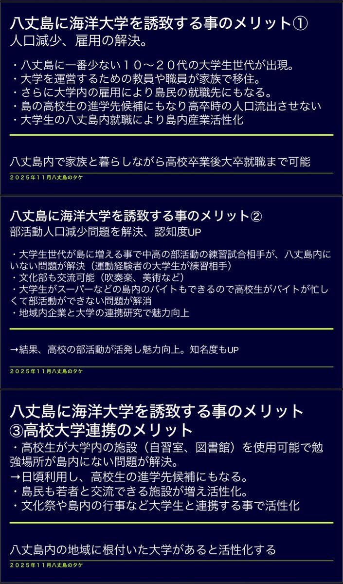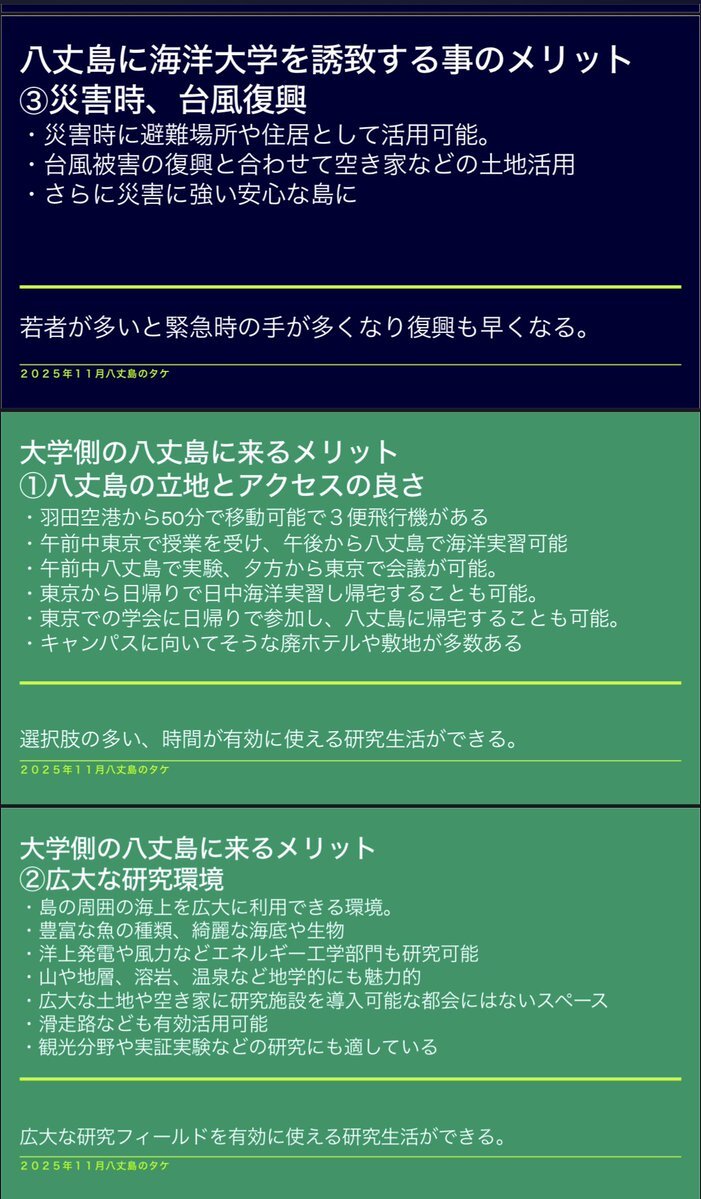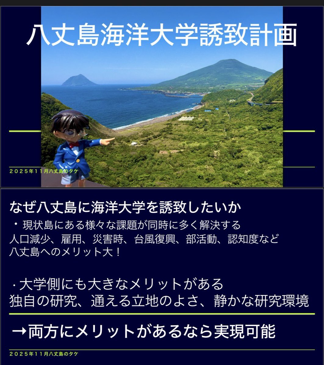 今日の八高八丈学の島民会議で高校生の話を聞いて刺激を受けたので僕も八丈学的な提案作成しました! 八丈島海洋大学誘致計画です! メリットしかないのでぜひ! #八丈島 #海洋大学 #大学誘致 #八丈学 pic.x.com/y2JmTm58nr