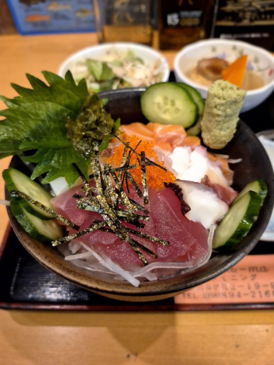 昼メシ YouTubeで海の吉田さんがオススメしてた!海鮮丼🐟食べたよΨ( 'ч' ☆) したら!本人がいた〜! #ゴットマーマー #海鮮丼 #沖縄県魚突き倶楽部 #海の吉田 #吉田さんありがとうございます pic.x.com/lZdEKzoTRc