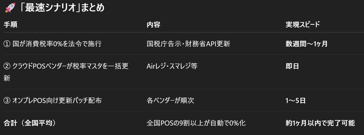 ChatGPTに消費税率0%にする最速のシナリオを聞いたら、約1か月で実現可能と回答が出た。遅くても3か月くらいで消費税0%にすることは実現可能だと思う。消費税0%にするってなったら、事業者、システムエンジニア達は、最優先で取り組むと思うけど。 #消費税 pic.x.com/7qTXk9s4PB