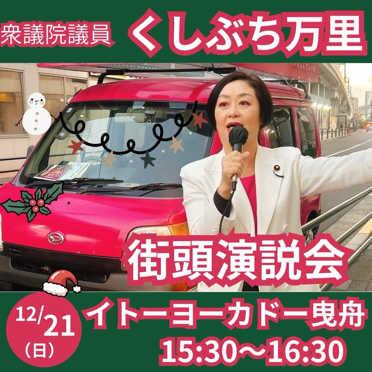 📣くしぶち万里 街宣📣 本日は曳舟‼️ 🎄12月21日(日)15:30~16:30 🎅場所:イトーヨーカドー曳舟店前 高市政権の2カ月で 日本の安全保障も 私たちの生活も不安が増大しています。 / 国民の手に政治を取りもどそう! \ 人々の物価高対策よりも、財界やアメリカ・ファースト優先にNO!