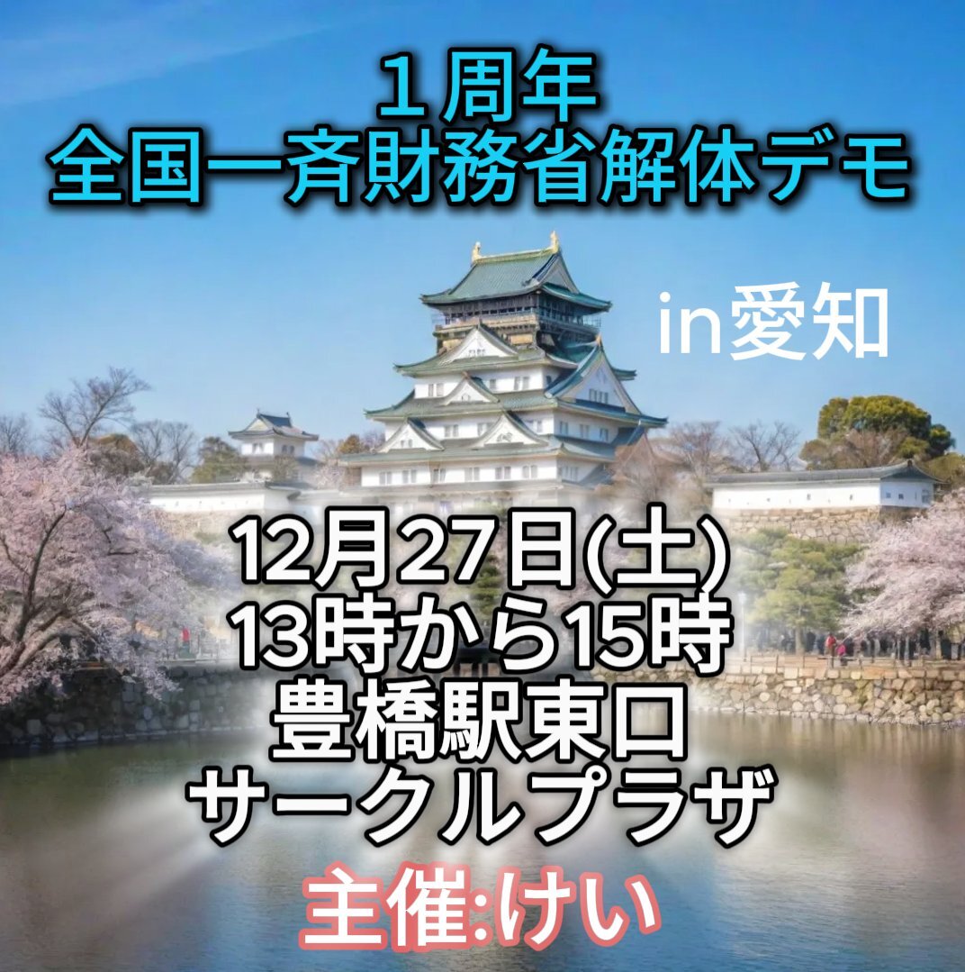 #財務省解体デモ #消費税廃止 12/27【13時~15時】全国開催デモのお知らせ 場所:愛知豊橋駅東口 サークルプラザ 主催:けい様 アカ不明 プライマリーバランス黒字化目標廃止一択(PB黒字化目標不要) 財政の民主化運動で増税反対!積極財政!緊縮財政停止! x.com/usagidesyo/sta… #大谷翔平 GO