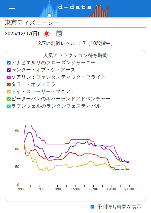 12/08の美女と野獣“魔法のものがたり”の待ち時間予測 平均待ち時間:87分 最長待ち時間:121分(09:30) 最短待ち時間:30分(20:45) 詳しい予想→d-data.soncho-works.com/attraction/21 #TDL #混雑予想