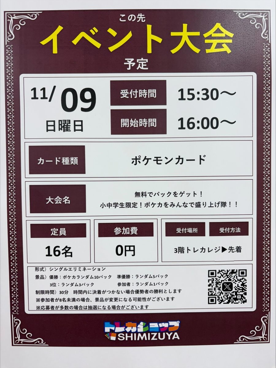 🔥11月9日の大会予定🔥 ✅16:00からポケカ大会を開催‼ こちら無料で参加可能です‼️ 無料でパックをゲットしよう‼️ 皆様のご参加お待ちしております🙇♀️ #ポケカ #清水屋 pic.x.com/WEOdwvnwcm
