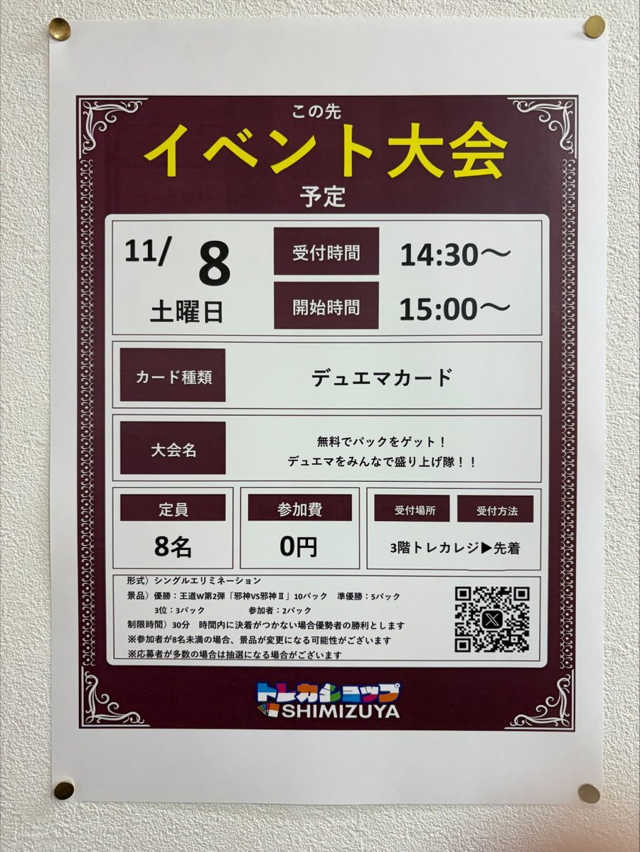 🔥11月8日の大会予定🔥 ✅15:00からデュエマ大会を開催‼ こちら無料で参加可能です‼️ 無料でパックをゲットしよう‼️ 皆様のご参加お待ちしております🙇♀️ #デュエマ #清水屋 pic.x.com/JOv4wyT3yI