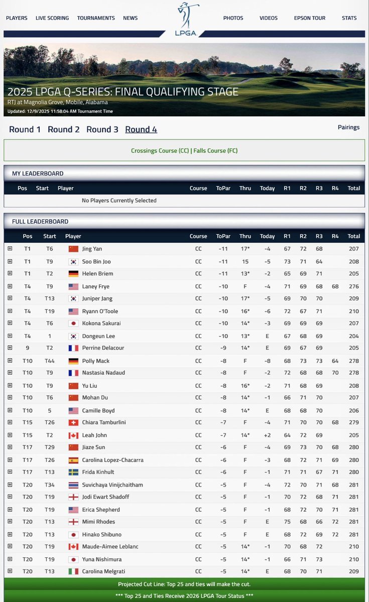 Leaderboard 2025 LPGA Q-SERIES: FINAL QUALIFYING STAGE #渋野日向子 最終ホール! 現在、5アンダー! 20位タイ 最終ホールがパーだと、かろうじて、合格! 最後の一踏ん張り! バーディを取れて、4アンダーから5アンダーになったのか! 頑張れ! live.lpgascoring.com/q-series/publi…