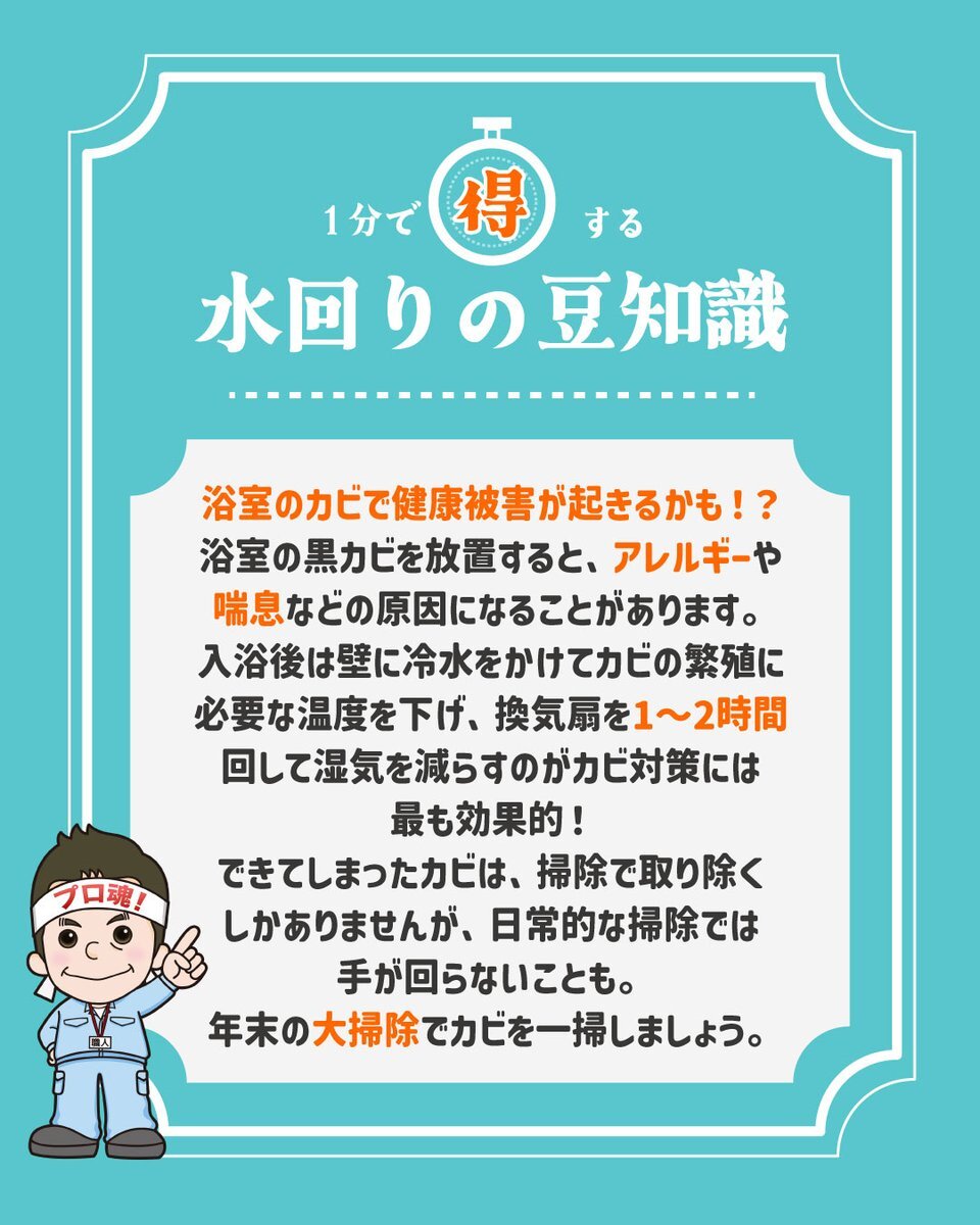 【浴室の黒カビ、放置は危険!】 アレルギー・喘息の原因になることも⚠️ 入浴後は壁に冷水→換気扇1〜2時間で繁殖予防。 できたカビは掃除で除去するしかありません。 年末の大掃除でしっかり一掃を!🧽✨ #水道職人 #水回りの豆知識 #カビ対策 #お風呂掃除 #健康管理 #湿気対策 #大掃除 pic.x.com/w4zvjqPCjL