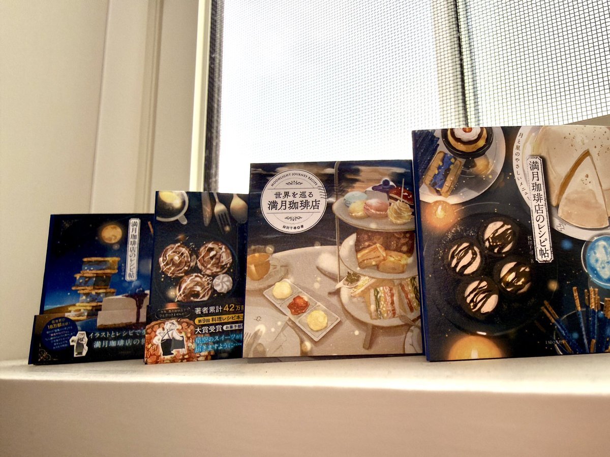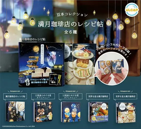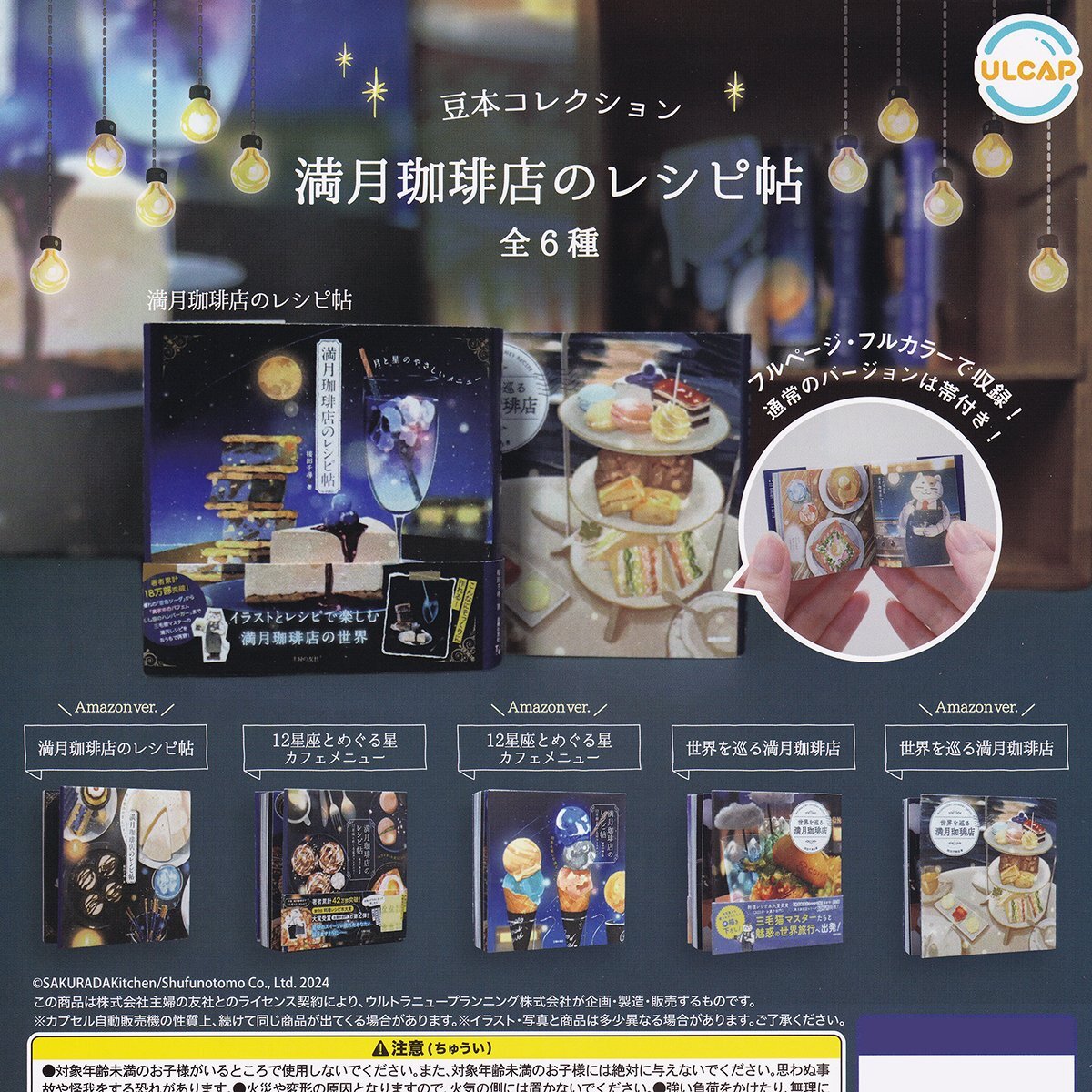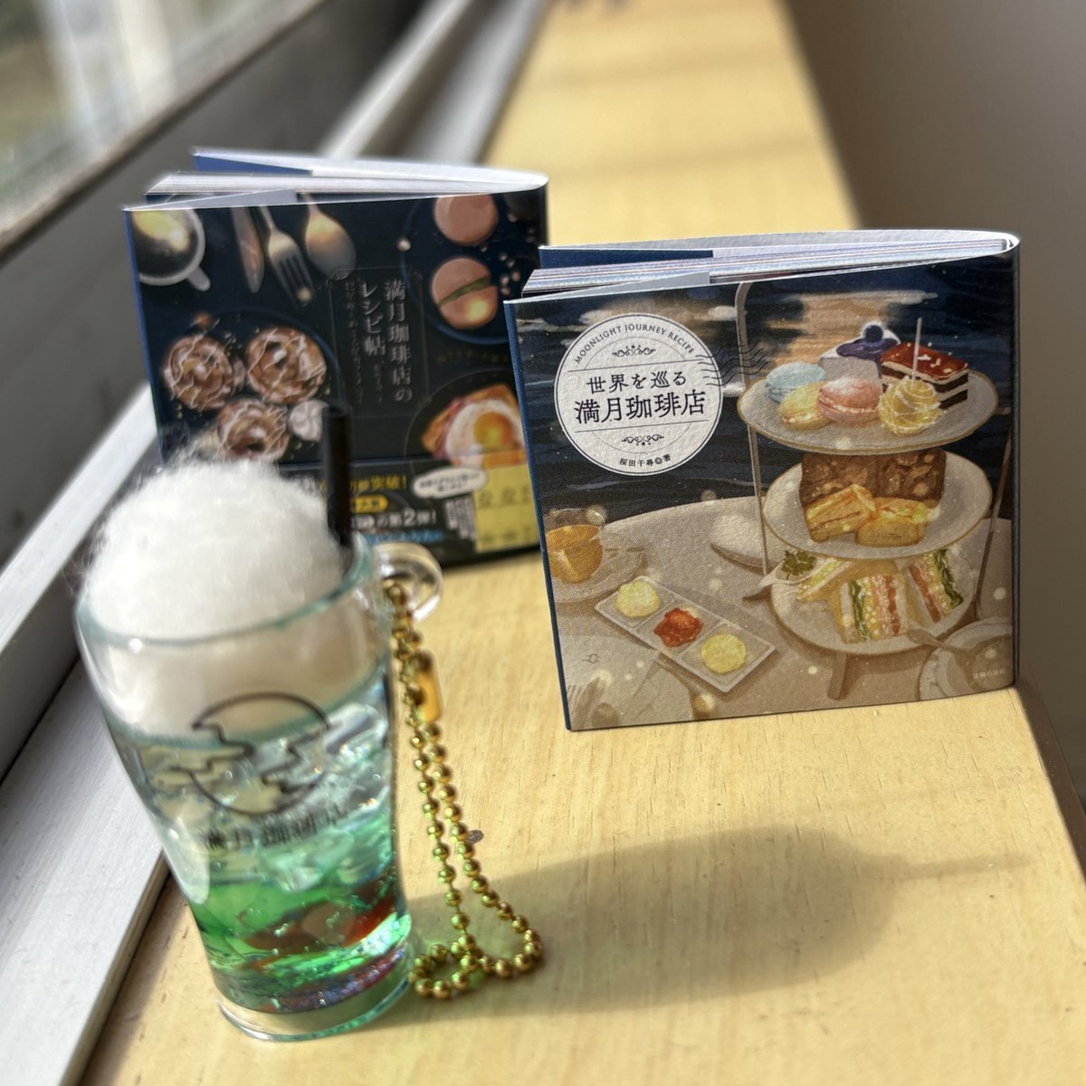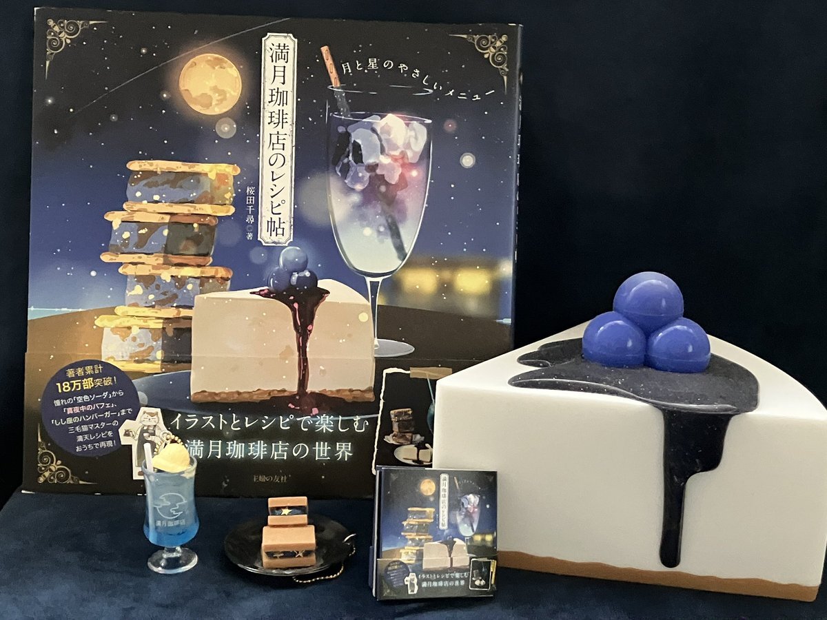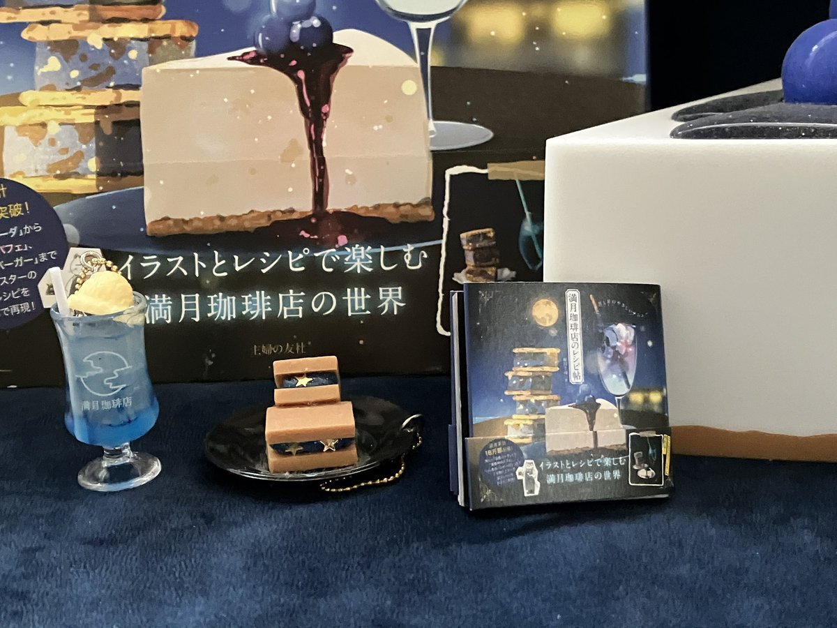 内容説明、大きなシリウスのチーズケーキはランプで、以前のブライズ。星空のバターサンドは、以前のガチャガチャ。レシピ貼は絶賛発売中🌕✨ 豆本とクリームソーダが新作ガチャです✨ #満月珈琲店 @ChihiroSAKURADA x.com/sayarosa/statu…