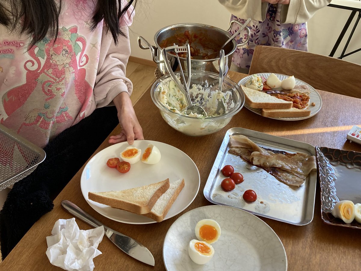 双子(10歳)が協力して作った、「夜明けのイングリッシュブレックファースト」 できあがったのはもう昼前だったけど笑、パジャマ姿で頑張りました! リエットは諦めて、ポテトサラダに変更🥔 (リエット食べてみたいな、クリスマスにでも作ってみようかな) #満月珈琲店 #世界を巡る満月珈琲店 pic.x.com/91HnhzxugB