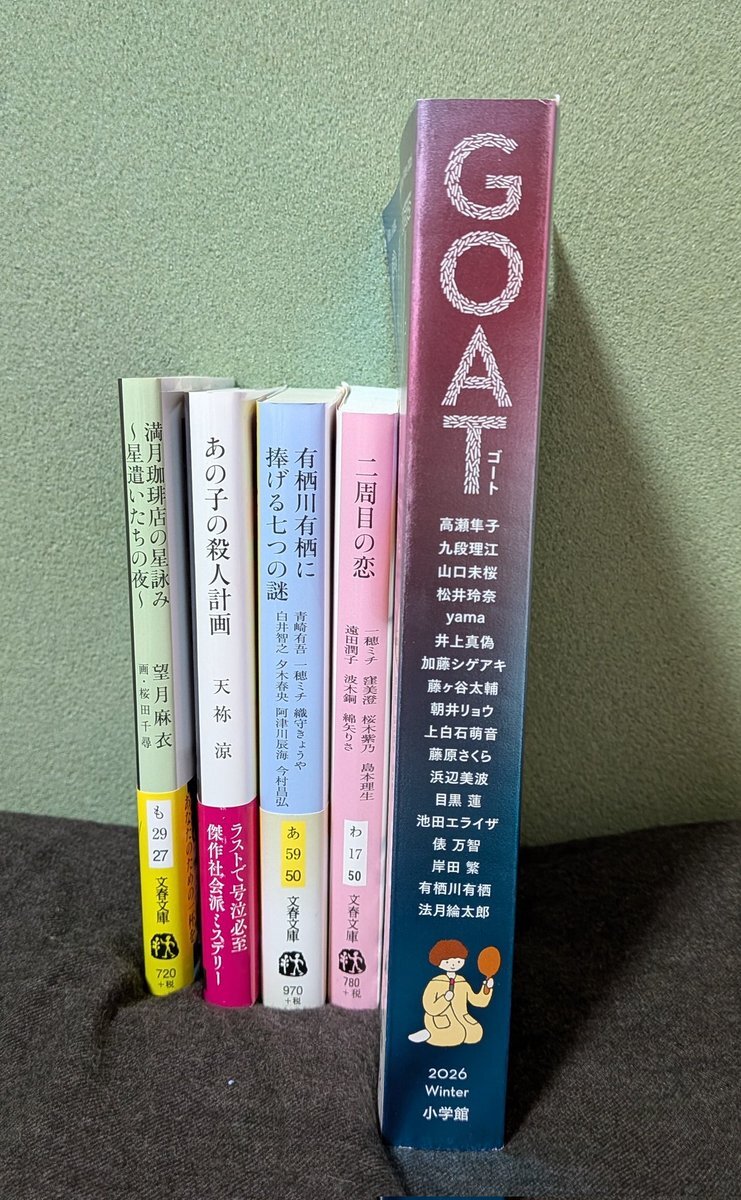 #今日買った・届いた本を紹介する GOAT3号と望月麻衣さんの #満月珈琲店 の新刊を本屋に買いに行ったら一穂ミチさん含む短編集と #有栖川有栖に捧げる七つの謎 と #二周目の恋 と天祢涼さんの #あの子の殺人計画 が気になり大量に衝動買いしてしまった(汗) pic.x.com/MYb4IgACIY