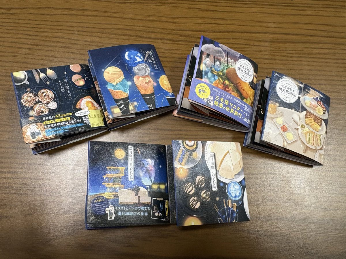 みてみてー右上のマメ本!めっちゃ小さいのだけど、開くとちゃんと本になってるの。 かわいい。 #満月珈琲店 pic.x.com/7yuUqgIDgI