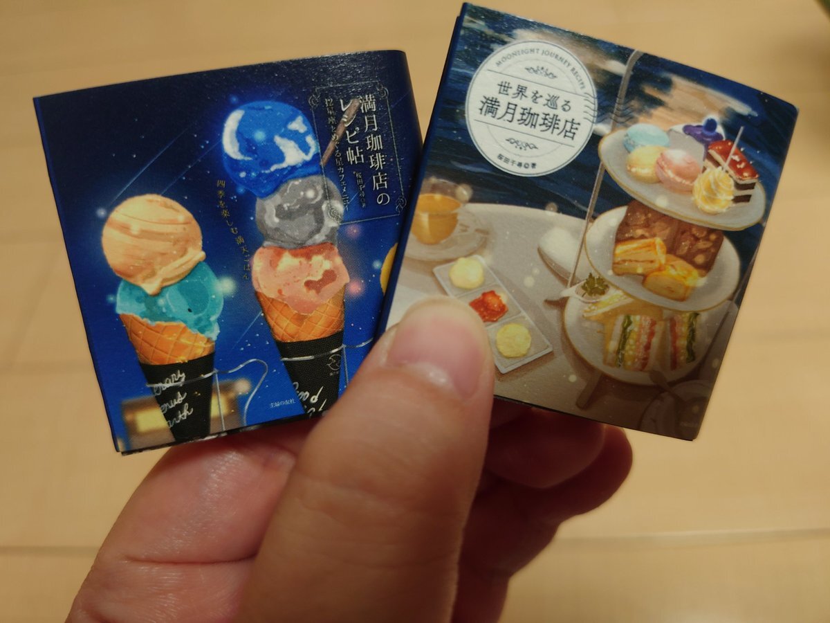 満月珈琲店新作ガチャ、ドリンクとレシピ貼の豆本まわしてきました!一回で一番欲しいのが出た!(珍しく) せっかくなので大小並べてみました😊 かわいい❤ #満月珈琲店 #カチャガチャ pic.x.com/yQ7gheVZdY