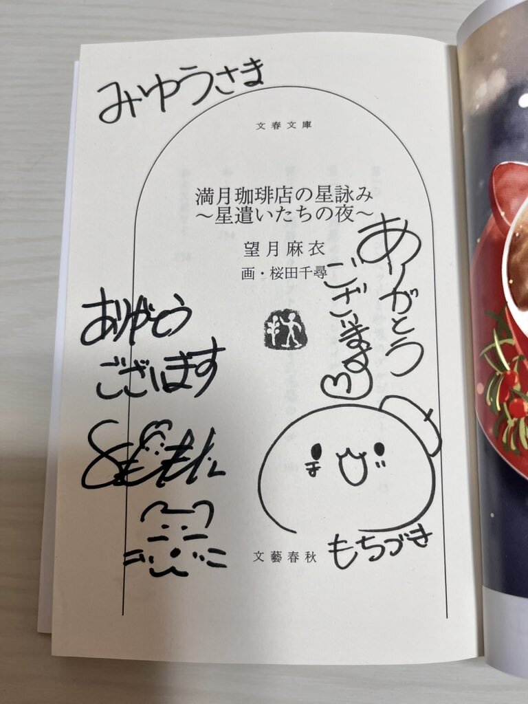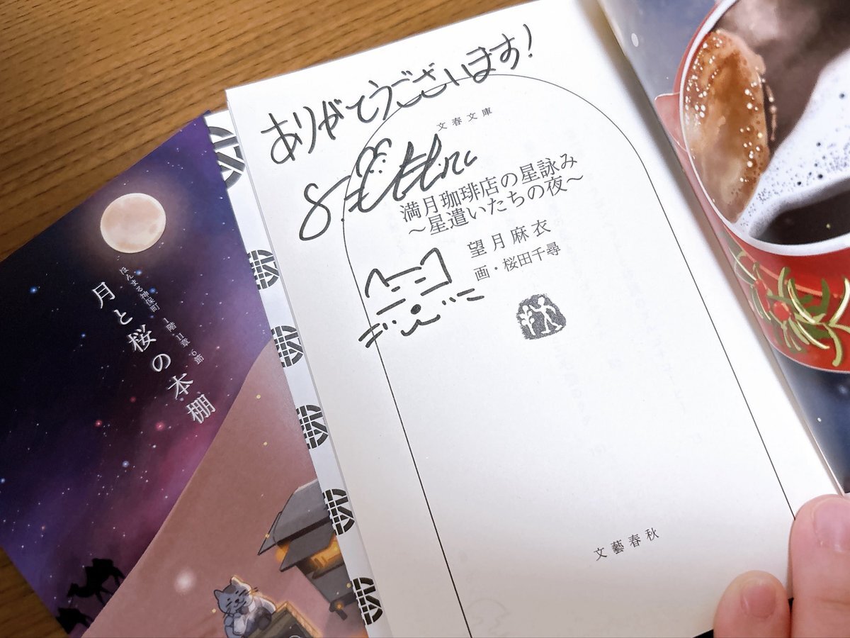 望月麻衣先生・桜田千尋先生の サイン会に行ってきました😍 初めてのサイン会、 目の前でサインしてる光景を眺めるだけで、 わぁぁぁぁ(((o(*゚▽゚*)o)))!状態 自分の名前が入った 世界にたった1冊の大切な本。 #望月麻衣 #桜田千尋 #満月珈琲店 pic.x.com/3FEZoevbQw