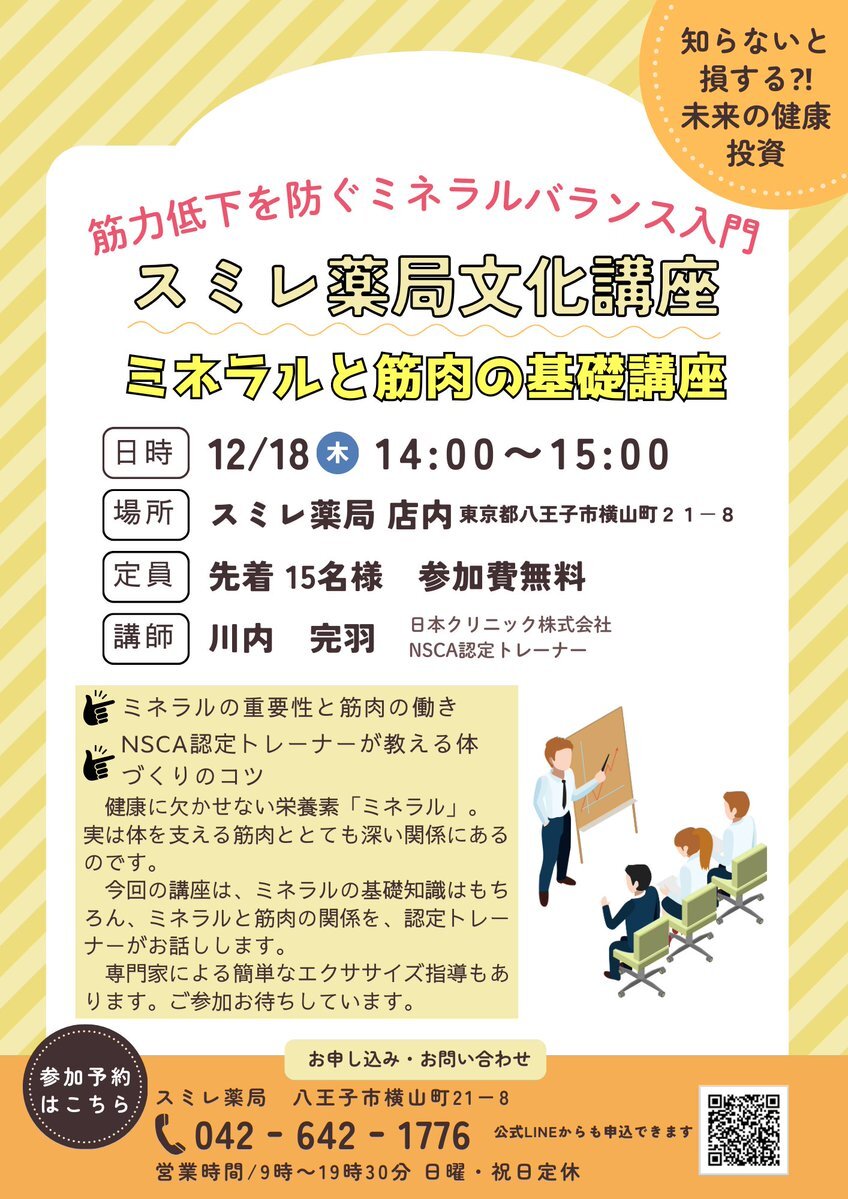 スミレ薬局 文化講座のお知らせ | スミレ薬局 sumire-p.co.jp/%e3%82%b9%e3%8… 健康に欠かせない栄養素の一つ「ミネラル」。実は体を支える筋肉ととても深い関係にあるのです。 今回の講座は、ミネラルと筋肉の関係を、認定トレーナーがお話します。 #筋肉 #フレイル #漢方相談 pic.x.com/TtBzdCCx0c