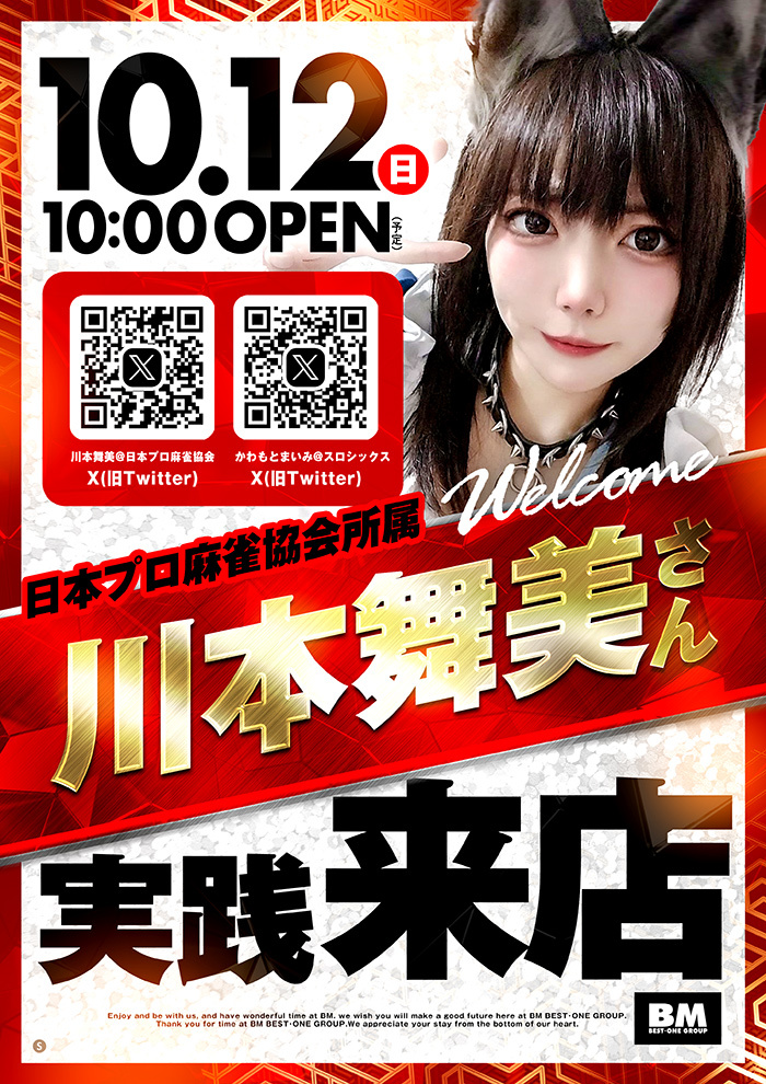 明日10/12(日)は 実践来店がアリます😆 かわもとまいみさんが @kawamotomaimi 朝イチ抽選からの参戦🀄️ Xの情報によると明日は “メイドで行きますよん”との事❤️ これは見逃せませんネ😊 皆様是非朝イチからご来店下さい❗️ 抽選時間は9:40ですよん😆 @maimi_slot #瀬田 #PR #スマスロ #スマパチ pic.x.com/dgGN6CF43l