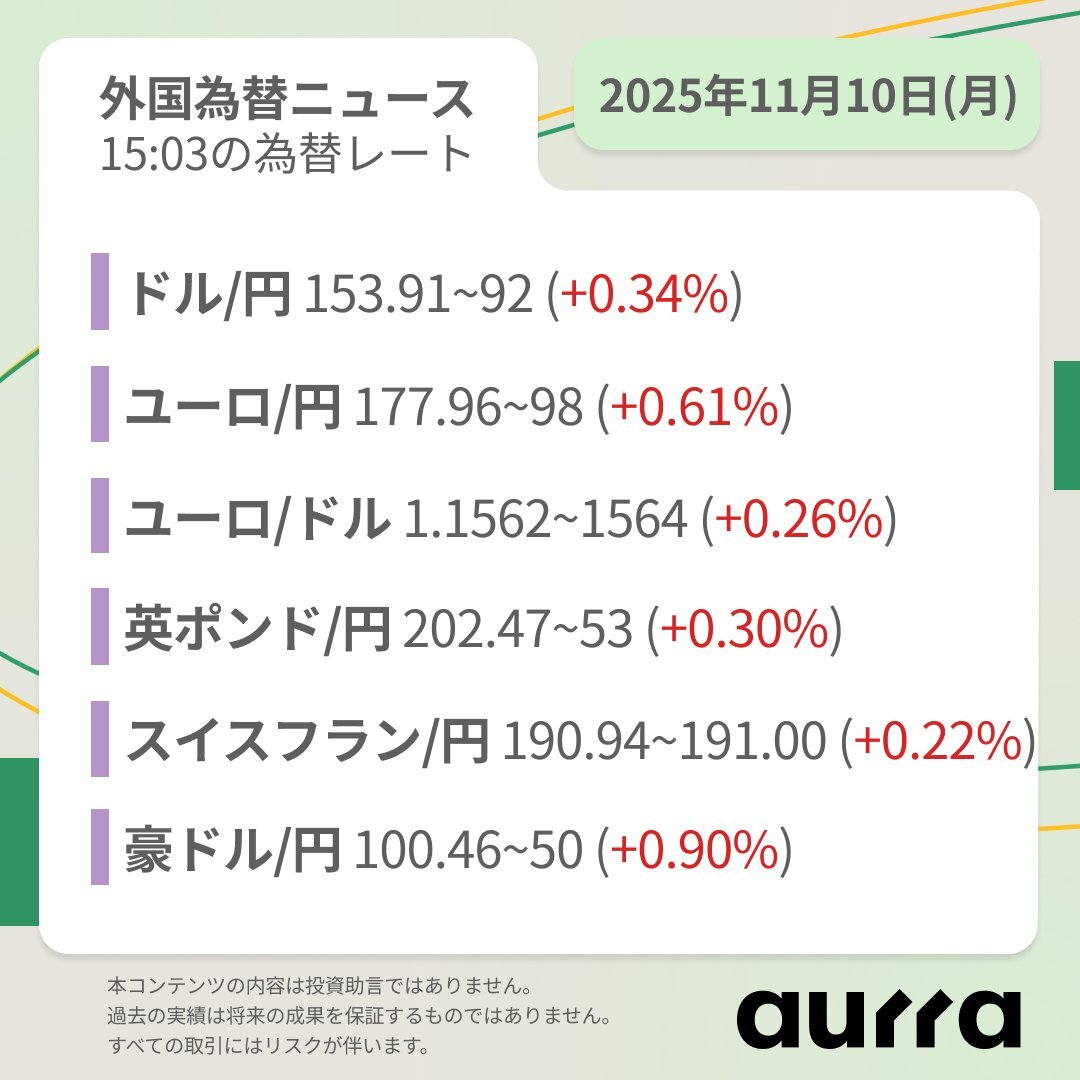 💱 外国為替市場ニュース|2025年11月10日(月) 15時03分の為替レートです。 ・ドル/円 $USDJPY 153.91~92 (+0.34%▲) ・ユーロ/円 $EURJPY 177.96~98 (+0.61%▲) ・ユーロ/ドル $EURUSD 1.1562~1564 (+0.26%▲) ・英ポンド/円 $GBPJPY 202.47~53 (+0.30%▲) ・スイスフラン/円 $CHFJPY 190.94~191.00 x.com/aurra_jp/statu…